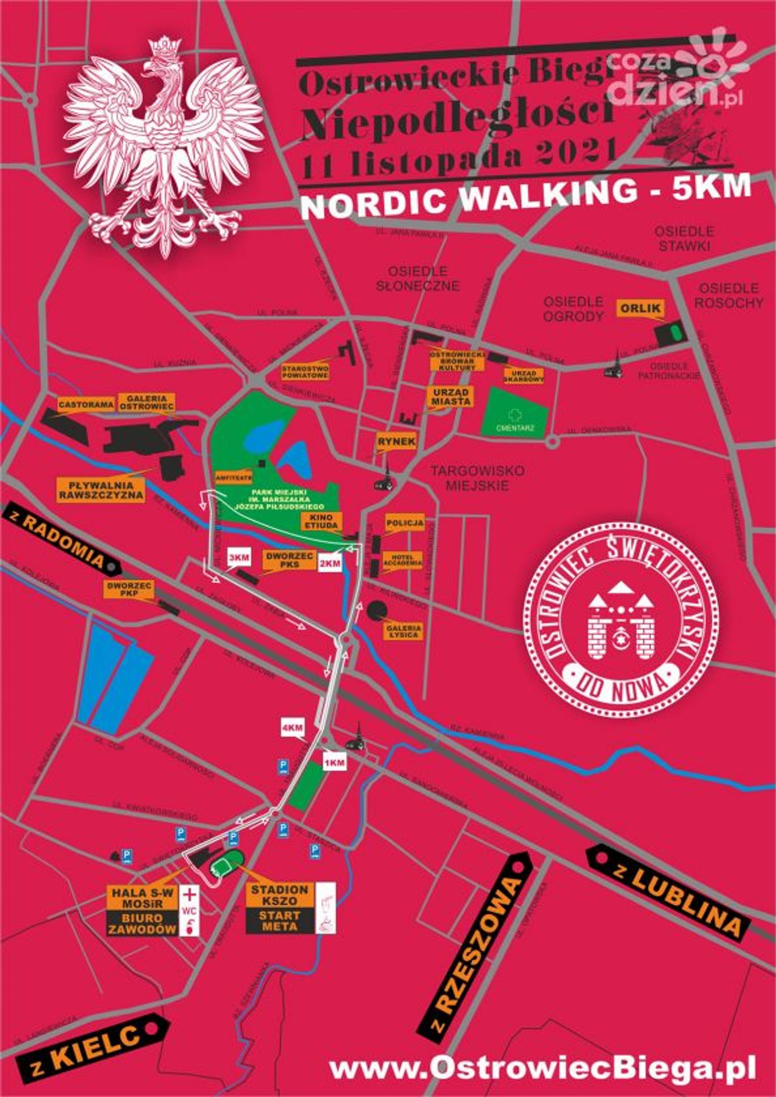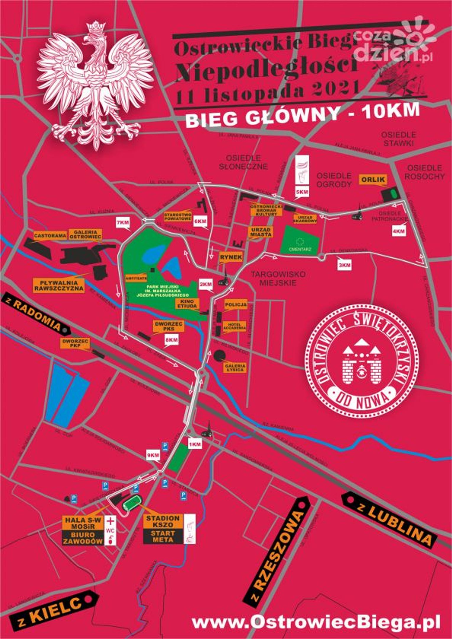 Obie tekonkurencje przeprowadzone zostaną na trasach wytyczonych ulicami OstrowcaŚwiętokrzyskiego ze startem i metą na Miejskim Stadionie Sportowym KSZO w Ostrowcu Świętokrzyskim (ul. Świętokrzyska 11). Opłata startowa za udział w biegu ulicznym ustalona została w wysokości 40zł (do 1 października) oraz 60zł (od 1 października do 6 listopada), a w dniu zawodów wynosić będzie już 80zł. Uczestnicy Marszu Nordic Walking mogą wykupić pakiet podstawowy za połowę obowiązującej stawki, który zawierał będzie medal, wodę i gorący posiłek oraz wstęp do strefy regeneracji na mecie, ale pozbawiony będzie okolicznościowych gadżetów biegowych. Organizator, podobnie jak w ubiegłym roku, zastrzega, że w przypadku konieczności odwołania imprezy z powodu obowiązujących ograniczeń pandemicznych na terenie kraju, dokona zwrotu wniesionych opłat startowych. Pula nagród w Biegu Głównym na 10km wzrosła w porównaniu do poprzednim edycji imprezy z ośmiu do dwunastu tysięcy złotych! Najlepsi w klasyfikacjach generalnych wśród mężczyzn i kobiet otrzymają 1000zł (za I miejsce), 800zł (II miejsce) i 600zł (III miejsce). Podium w klasyfikacjach wiekowych będzie w tym roku warte odpowiednio 400zł, 300zł i 200zł. Organizator zastrzega sobie ponadto możliwość ufundowania i wręczania innych dodatkowych nagród i wyróżnień. Wiadomo już też, że uczestnicy Ostrowieckich Biegów Niepodległości 2021 będą rywalizować na takich samych trasach jak przed dwoma laty (rok temu impreza została odwołana z uwagi na obowiązujące obostrzenia koronowirusowe). Start i meta Biegu Głównego (10km) usytuowane zostały na płycie głównej Miejskiego Stadionu Sportowego KSZO. Trasa przebiegać będzie kolejno ul. Świętokrzyską do Ronda 25-lecia NSZZ Solidarności, ul. Traugutta do Ronda Republiki Ostrowieckiej, kładką pieszą równoległą do wiaduktu w ciągu Alei 3 Maja do Ronda Powstania Styczniowego, Aleją 3 Maja, ul. Okólną, ul. Denkowską, ul. Chrzanowskiego, ul. Polną, ul. Iłżecką, przez Rynek Miasta, ul. Starokunowską, ul. Sienkiewicza, ul. Mickiewicza, ul. Żabią do Ronda Powstania Styczniowego i dalej tą samą drogą do mety - kładką pieszą równoległą do wiaduktu w ciągu Alei 3 Maja, ul. Traugutta i ul. Świętokrzyską do Miejskiego Stadionu Sportowego KSZO. Trasa Biegu Nordic Walking na Alei 3 Maja (na wysokości Kina Etiuda) skręci w Park Miejski im. Marszałka Józefa Piłsudskiego i znów połączy się z biegiem na ul. Mickiewicza. Zapisy prowadzone są na stronie internetowej www.ostrowiecbiega.pl.