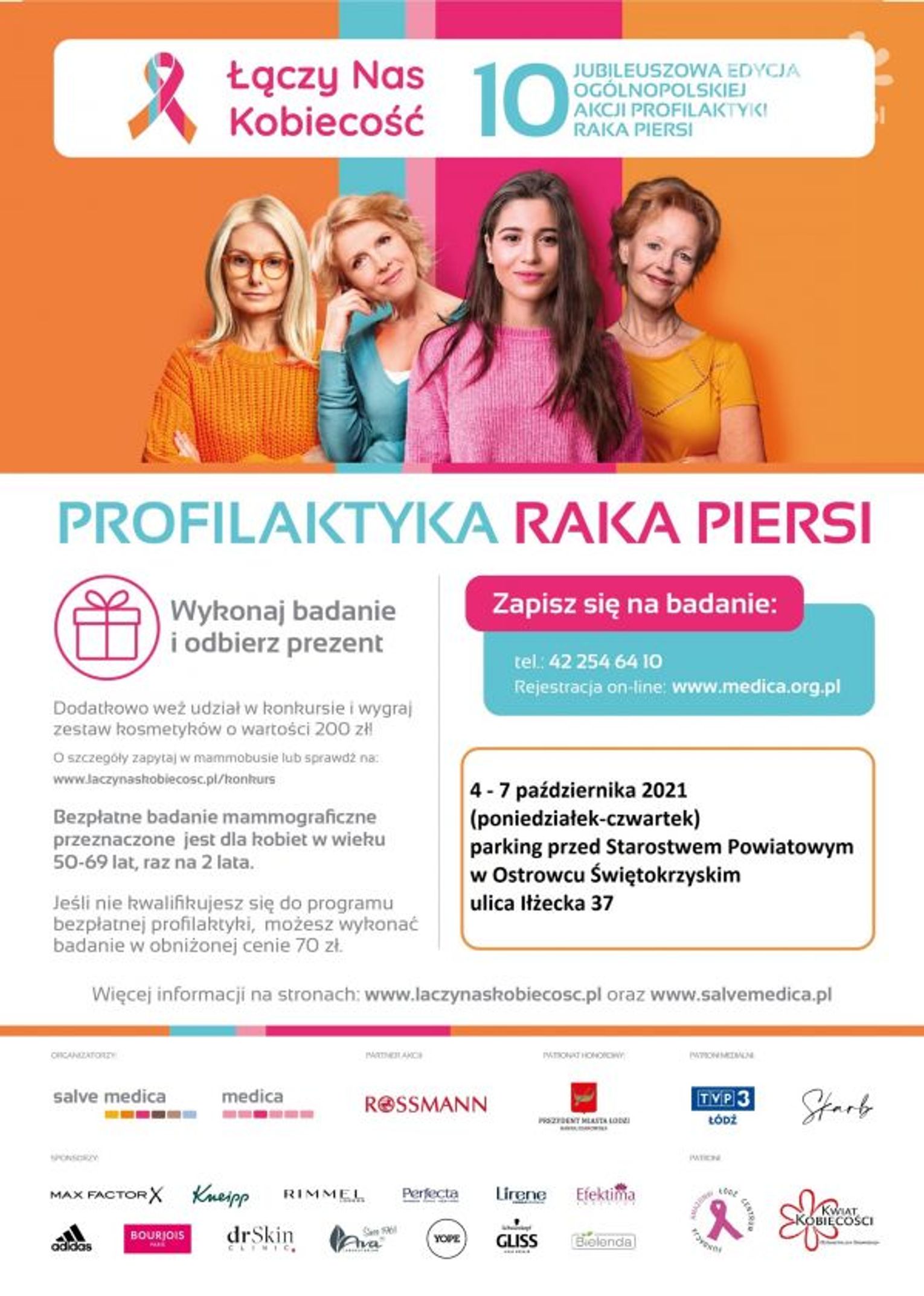 Od 4 do 6 października 2021 roku przed Starostwem Powiatowym wszystkie Panie w wieku od 50 do 69 lat z terenu powiatu ostrowieckiego będą mogły bezpłatnie wykonać mammografię. Jest to już 10. Jubileuszowa edycja Akcji Profilaktyki Raka Piersi.