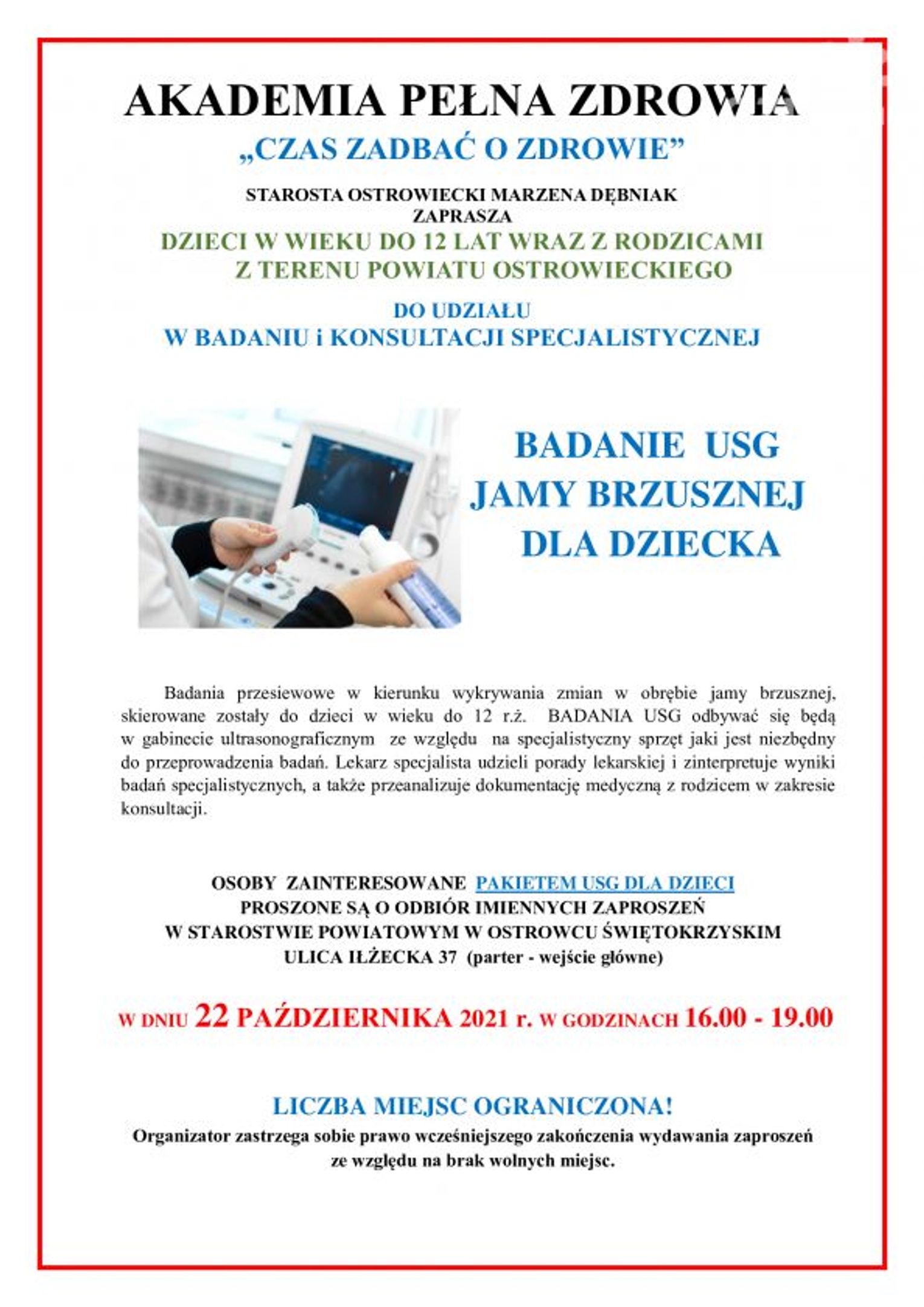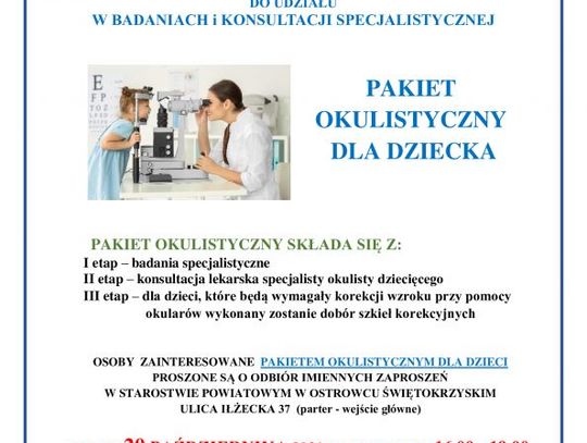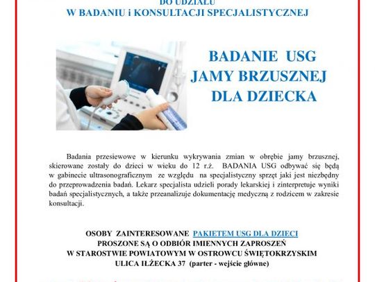 Powiat ostrowiecki organizuje zapisy na badania w kierunku wykrywania zmian w obrębie jamy brzusznej, skierowane do dzieci w wieku do 12 lat oraz specjalistyczne badania wzroku dla dzieci w wieku od 6 do 18 lat.