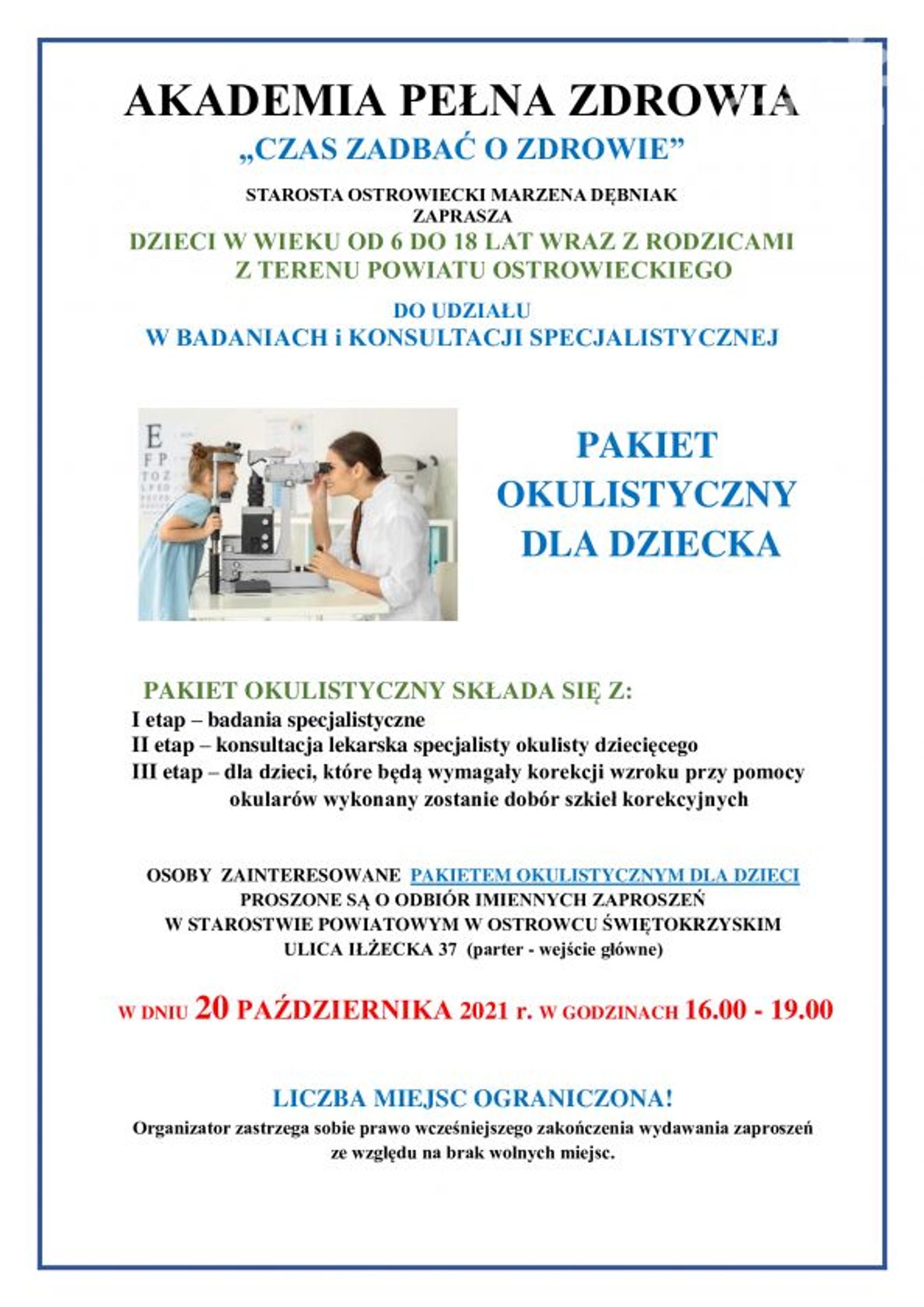Tym razem Akademia Pełna Zdrowia wychodzi naprzeciw oczekiwaniom rodziców, którzy zgłaszali potrzebę przeprowadzenia badań wśród najmłodszych mieszkańców powiatu ostrowieckiego. Zapisy na badanie okulistyczne będą prowadzone 20 października w budynku Starostwa Powiatowego przy ul. Iłżeckiej 37 w godzinach od 16.00 do 19.00, natomiast na badanie USG jamy brzusznej 22 października, również w godzinach od 16 do 19.