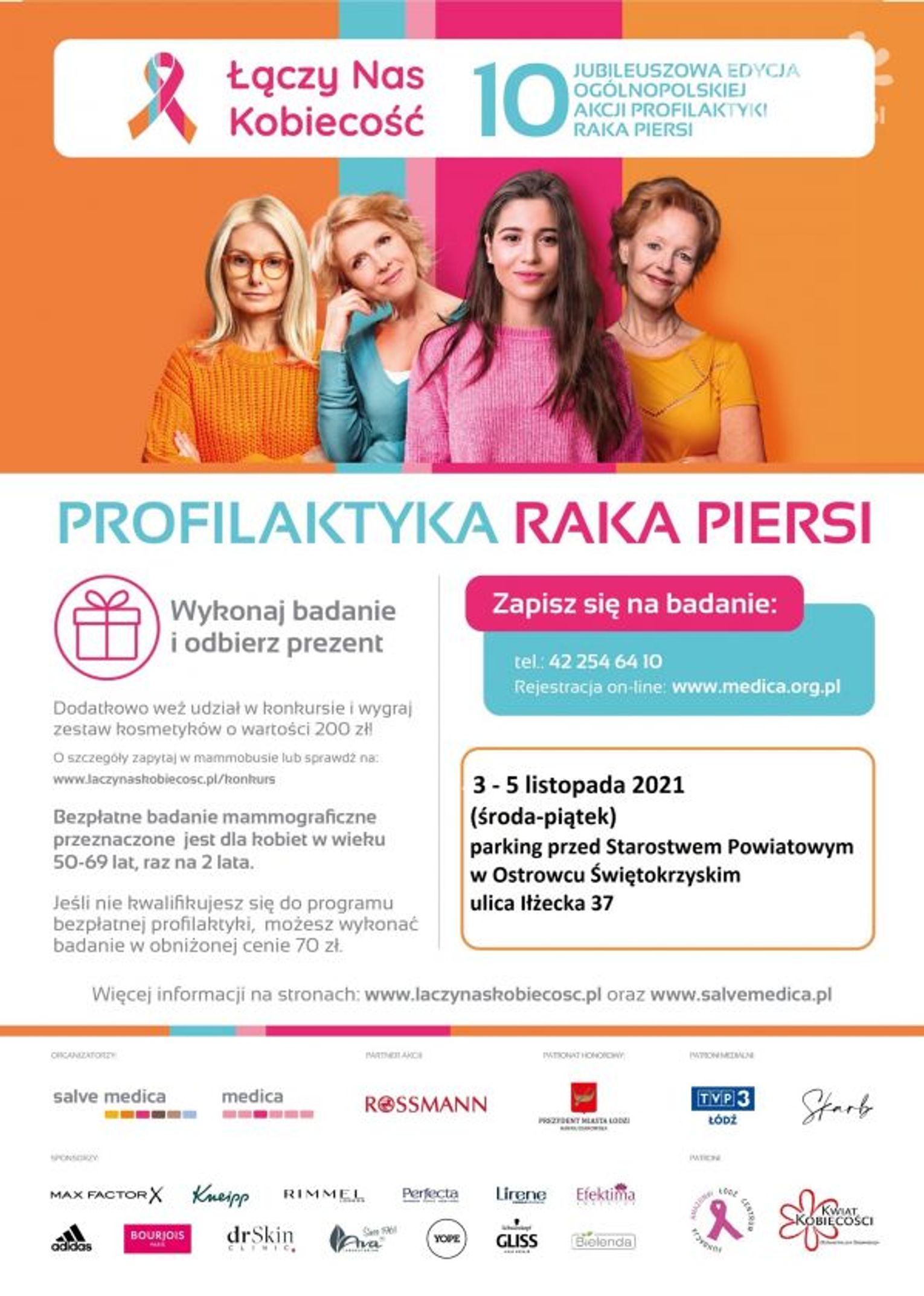 W dniach od 3 do 5 listopada przed Starostwem Powiatowym w Ostrowcu Świętokrzyskim po raz kolejny stanie mammobus. Panie w wieku 50-69 lat, które nie wykonywały badania w ciągu ostatnich dwóch lat, będą mogły wykonać bezpłatną mammografię.