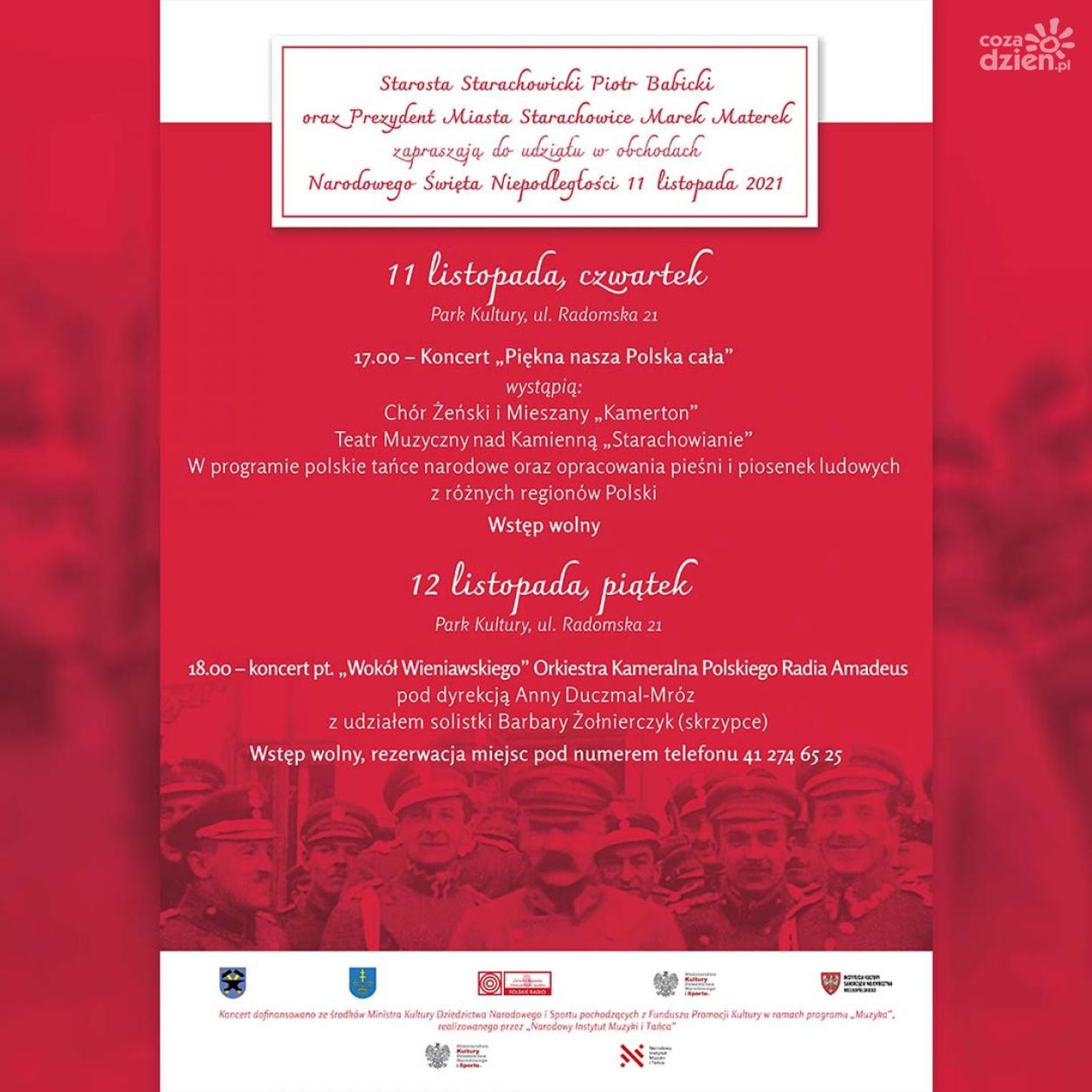 11 listopada w Parku Kultury odbędzie się koncert pt. :"Piękna nasza Polska cała". W programie przewidziano polskie tańce narodowe oraz opracowania pieśni i piosenek ludowych z różnych regionów Polski. W trakcie koncertu wystąpią: Chór Żeński i Mieszany ,,Kamerton” oraz Teatr Muzyczny nad Kamienną ,,Starachowianie”.