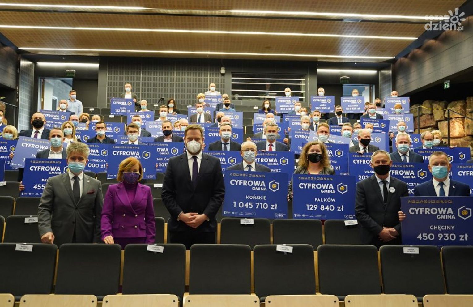 Drugi w kolejności pod względem wartości przyznanej promesy będzie Bodzechów, który otrzyma prawie 400 tys. zł a kolejną gmina Kunów z prawie 300 tys. zł. Pozostałe gminy a więc Bałtów otrzyma 100 tys. a Ćmielów oraz Waśniów po ponad 200 tys zł. Cyfrowa Gmina to projekt przeznaczony na wsparcie procesów cyfryzacji w poszczególnych gminach. A dokładniej zakup sprzętu oraz instalację sieci informatycznych dla jednostek samorządowych oraz podległych im instytucji bez placówek ochrony zdrowia. W ramach programu przewidziano także możliwość zakupu sprzętu IT dla szkół, placówek specjalnych i domów pomocy społecznej. Dofinansowanie obejmuje również specjalistyczne szkolenia oraz zapewnienie cyberbezpieczeństwa samorządowych systemów informatycznych. Pieniądze mają pochodzić z unijnego programu React EU z Funduszy Europejskich. Uroczyste wręczenie promes a więc gwarancji przyznania tych środków odbyło się w urzędzie wojewódzkim. Uczestniczył w nich minister Janusz Cieszyński, który stwierdził, że każdy samorząd dzięki temu będzie mógł zainwestować w infrastrukturę informatyczną na najwyższym poziomie, a więc zakupić sprzęt, usługi oraz przeprowadzać szkolenia. W pierwszym naborze do programu mogły wziąć udział 733 gminy. Kwota przeznaczonego dla nich wsparcia to ponad 178 milionów złotych, a świętokrzyskie samorządy otrzymały w tej odsłonie programu łącznie 29 milionów złotych. Pozostałe gminy będą mogły uczestniczyć w kolejnych naborach.