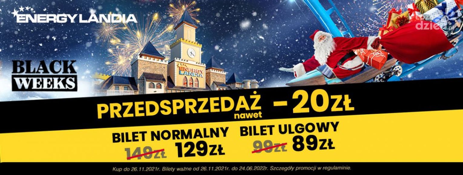 Przez niemal siedem miesięcy, bo od 26.11.2021 do 24.06.2022 można będzie cieszyć się atrakcjami Największego Parku Rozrywki w Polsce w obniżonej cenie. Wszystko za sprawą Black Weeks, który zawita w Energylandii w dniach 15-26.11.2021. W tych dniach Park Roller Coasterów nr 1 w Europie ogarnie istny szał promocji! Już od 15 listopada w przedsprzedaży internetowej można będzie zakupić bilety w promocyjnej cenie, do – 40 zł w przypadku wejściówek dwudniowych i do –20