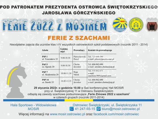 Dodatkowo w dniu 29 stycznia o godzinie 10.00 w sali konferencyjnej Hali Sportowo – Widowiskowej MOSiR w Ostrowcu Świętokrzyskim przy ul. Świętokrzyskiej 11 odbędą się zawody szachowe podsumowujące „Ferie Zimowe 2022 z szachami”.