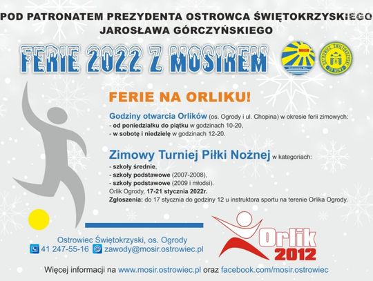 W okresie ferii zimowych oba ostrowieckie Orliki będą otwarte od poniedziałki do piątku w godzinach 10-20, a w sobotę i niedzielę w godzinach 12-20. Od 17 do 21 stycznia na Orliku Ogrody zaplanowano ponadto przeprowadzenie Zimowego Turnieju Piłki Nożnej w trzech kategoriach wiekowych: - szkoły średnie, - szkoły podstawowe (roczniki 2007-2008), - szkoły podstawowe (roczniki 2009 i młodsi). Zgłoszenia na formularzach przyjmowane będą do 17 stycznia do godziny 12 u instruktora sportu na Orliku Ogrody. Tego samego dnia o godzinie 12 odbędzie się spotkanie organizacyjne z opiekunami drużyn, na którym dokonane zostanie losowanie oraz ustalony system gier. Udział w turnieju jest bezpłatny. Więcej informacji pod numerem telefonu 41 247-55-16.