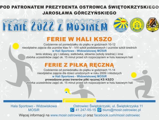 Codziennie od poniedziałku do piątku w godzinach 10-12 w Hali Sportowo – Widowiskowej przy ul. Świętokrzyskiej 11 odbywać się będą nieodpłatne zajęcia z piłki ręcznej dla dzieci urodzonych w 2009 roku i młodszych. Zajęcia prowadzić będą trenerzy sekcji piłki ręcznej KS KSZO. Zbiórka uczestników zajęć około 15 minut przed ich rozpoczęciem w holu kasowym hali.