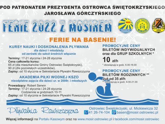 Miejski Ośrodek Sportu i Rekreacji w Ostrowcu Świętokrzyskim przygotowuje promocję pn. „Ferie na Rawszczyźnie”. W jej ramach zostaną zorganizowane kursy pływackie, będą oferowane tańsze bilety wstępu i możliwość potrenowania waterpolo. Promocja będzie trwać w dniach 17-30 stycznia.