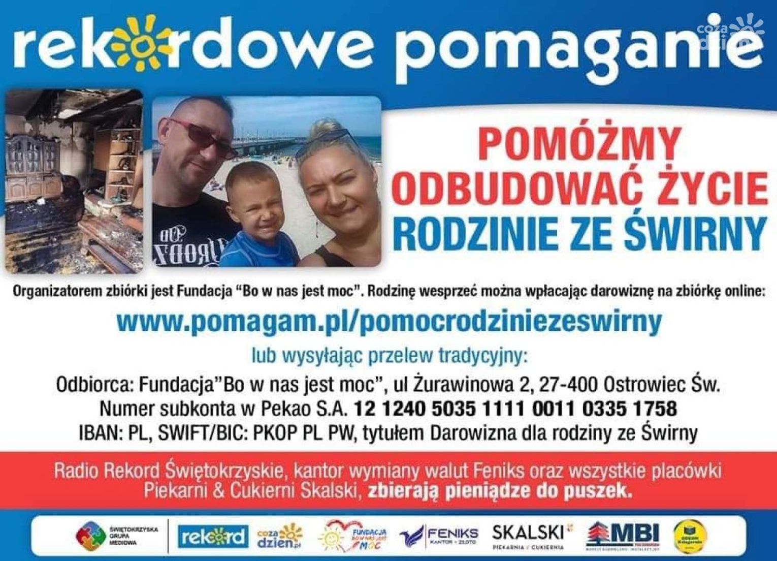 31.12.2021 roku rozegrał się dramat Państwa Anety i Tomasza oraz ich 4-letniego synka z miejscowości Świrna w gminie Bodzechów. W godzinach rannych doszło do pożaru ich jednorodzinnego domu. Pożar strawił dobytek całego życia rodziny. W jednej chwili rodzina ta pozbawiona została dachu nad głową, jak również podstawowych sprzętów gospodarstwa domowego i rzeczy codziennego użytku. Dom najprawdopodobniej trzeba będzie odbudować od fundamentów, gdyż drewniana konstrukcja mocno ucierpiała w trakcie pożaru.