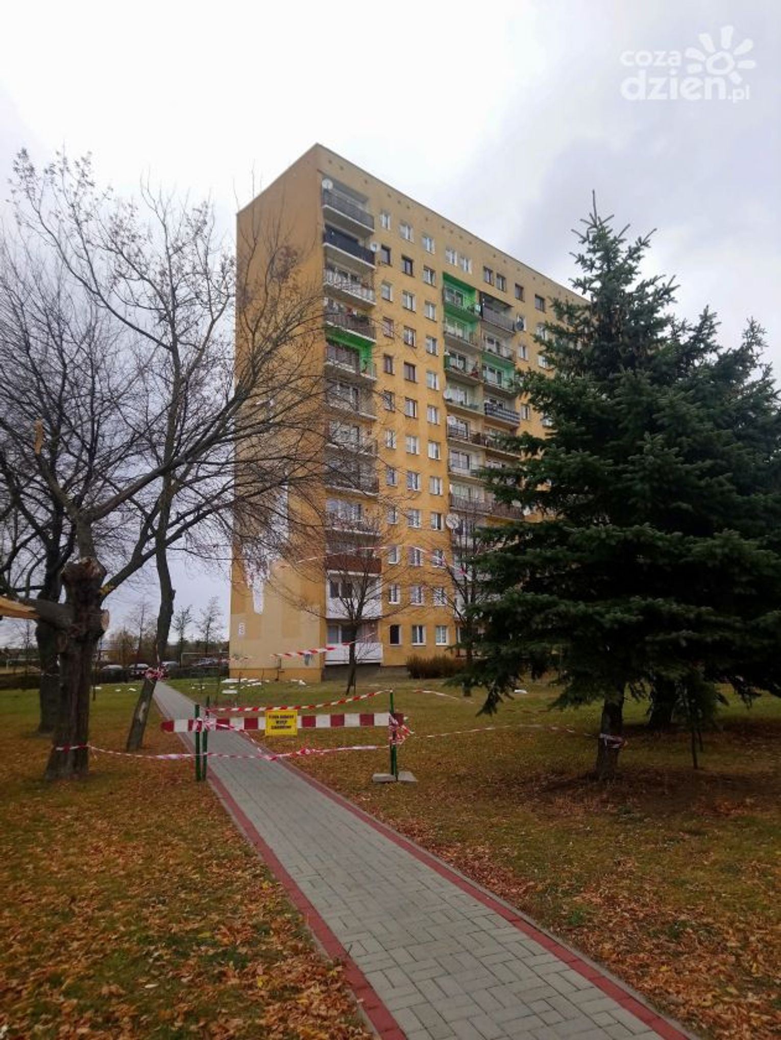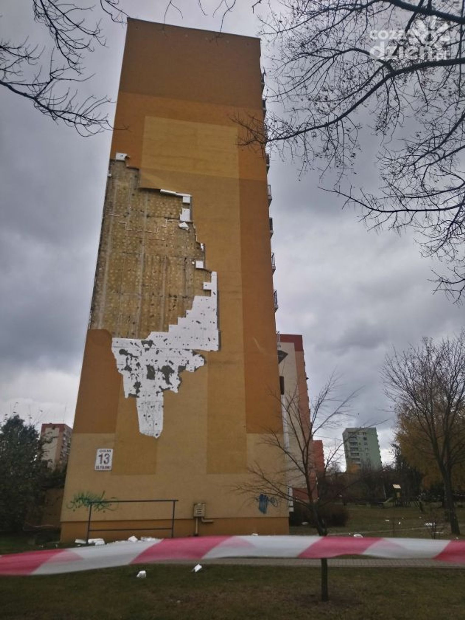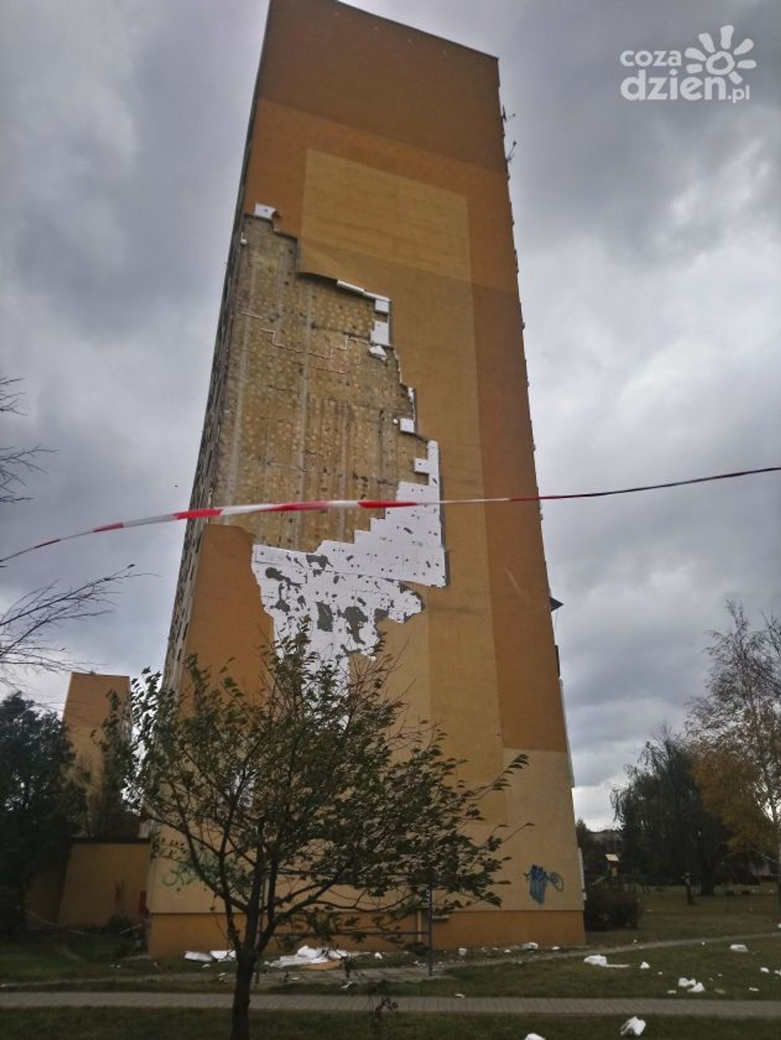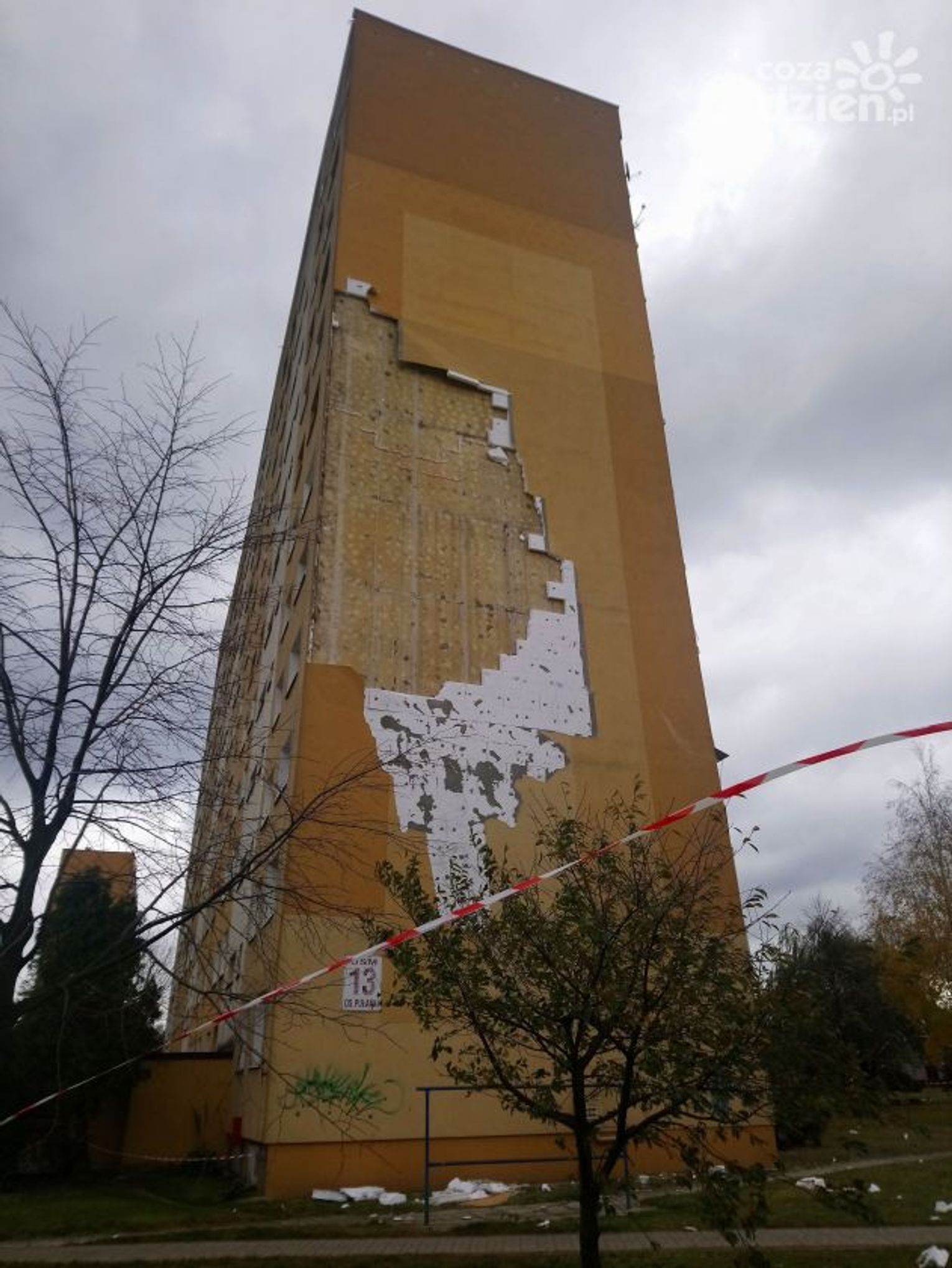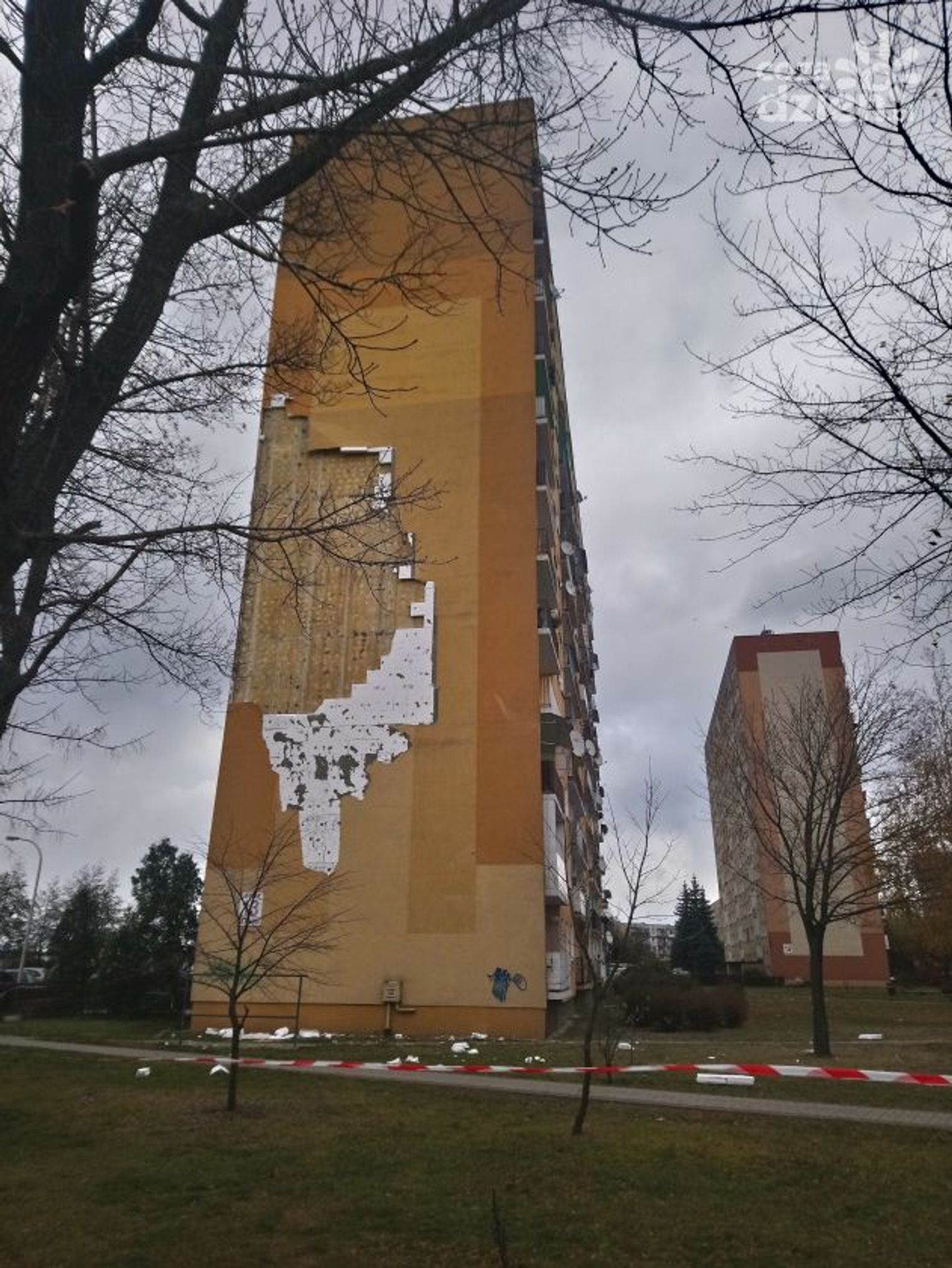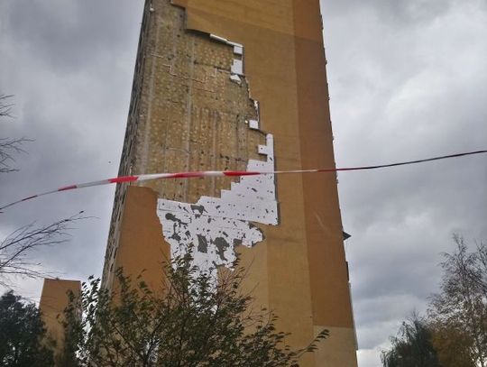 Tam z bocznej ściany budynku odpadł fragment ocieplenia. Można wyobrazić sobie, jaka musiała być siła podmuchu.