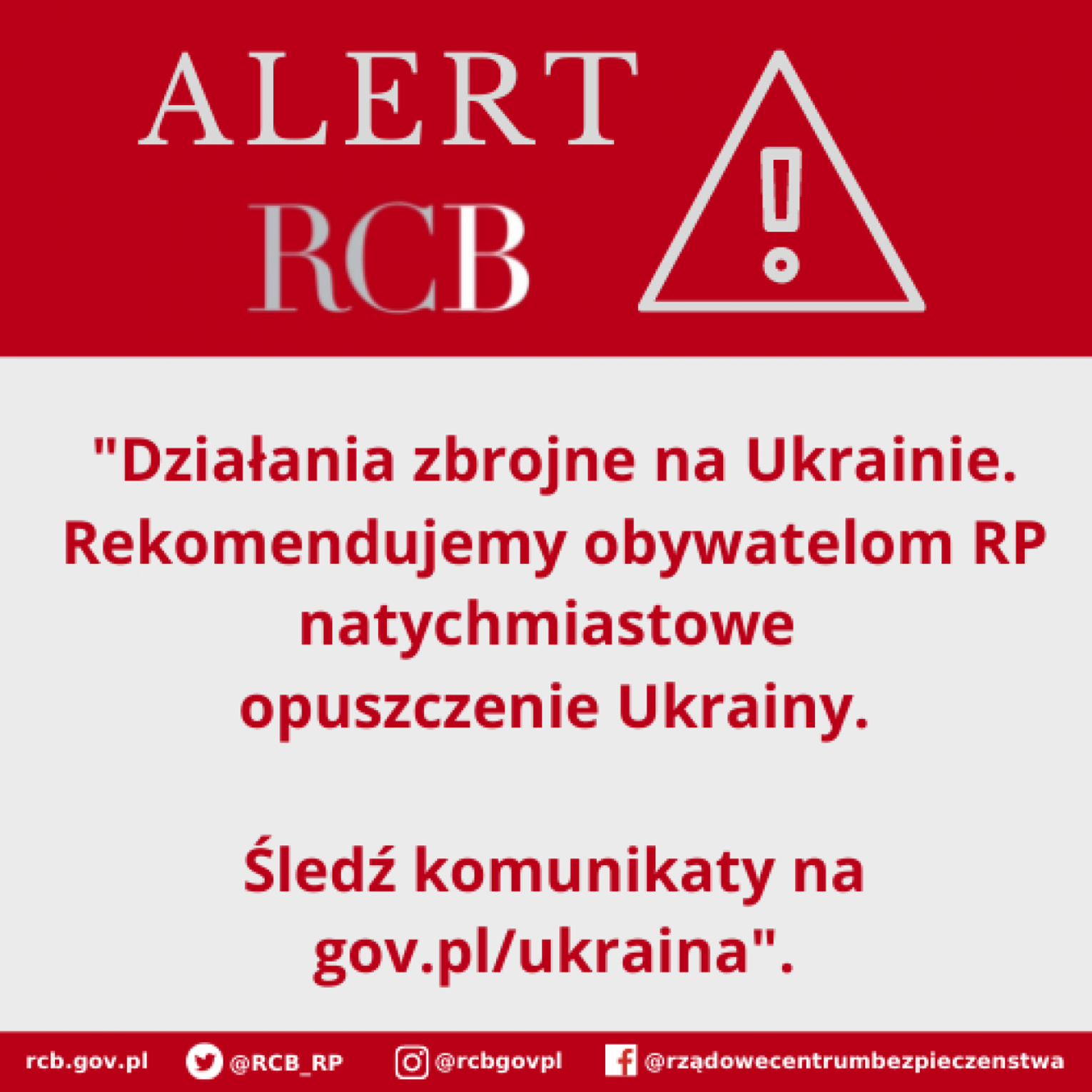 „Działania zbrojne na Ukrainie. Rekomendujemy obywatelom RP natychmiastowe opuszczenie Ukrainy. Śledź komunikaty na gov.pl/ukraina.”