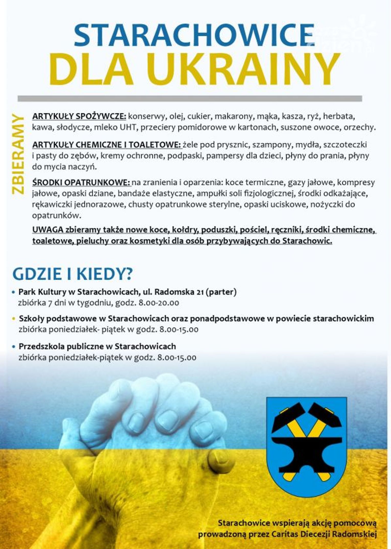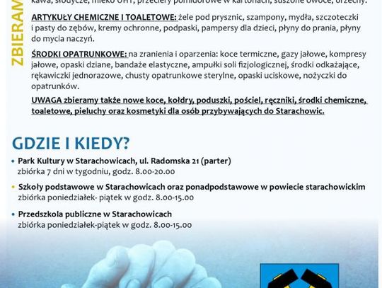 Zbierane są także nowe koce, kołdry, poduszki, pościel, ręczniki, środki chemiczne, toaletowe, pieluchy oraz kosmetyki dla osób przybywających do Starachowic.