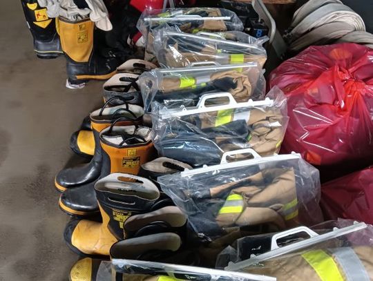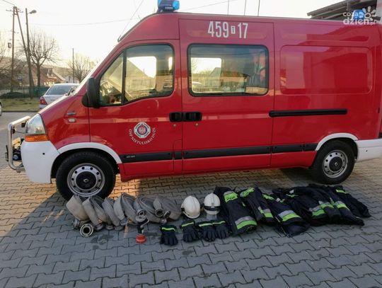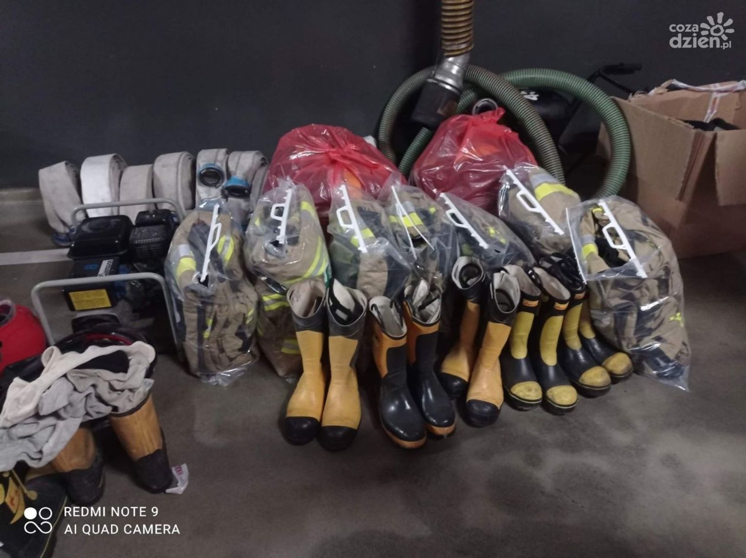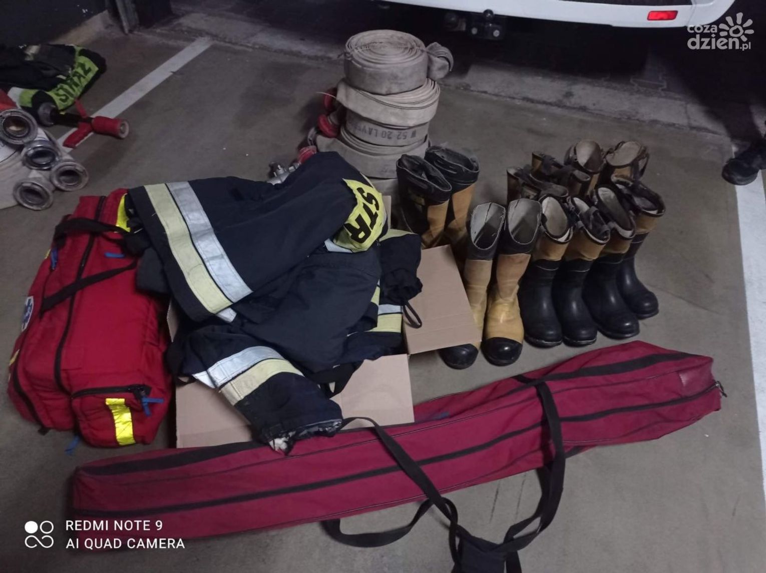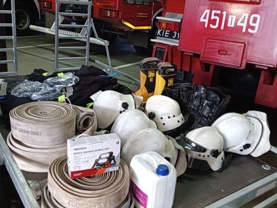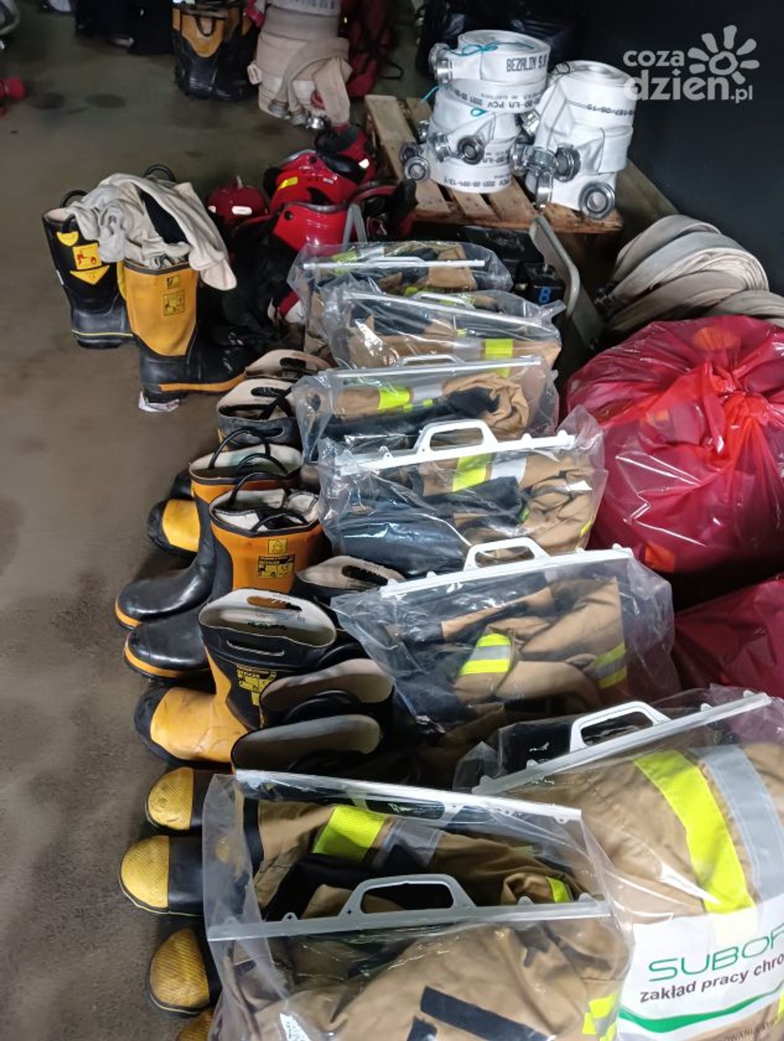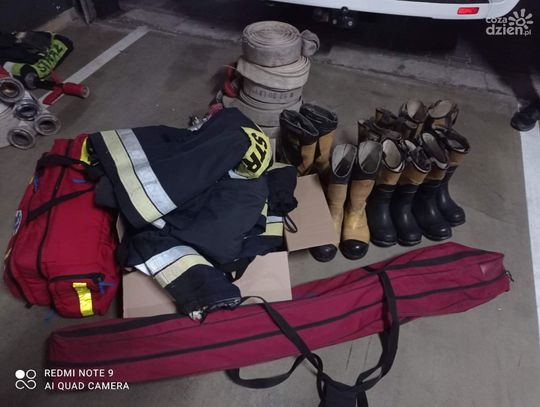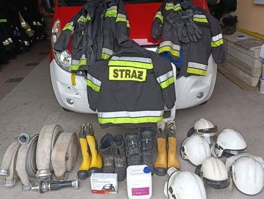 -Hełm strażackie - 39 sztuk, buty specjalne gumowce - 23 pary, buty skutery - 2 pary, wąż W-75 - 42 sztuki, wąż W-52 - 34 sztuki, prądownica PW 52 - 16 sztuk, ubranie specjalne Nomex - 34 komplety, rękawice specjalne - 16 par, kominiarki - 3 sztuki, zestaw PSP R 1 kompletny - 1 sztuka, zestaw PSP R 1 bez tlenu - 2 sztuki, pompa przenośna szlamowa - 2 sztuki, pompa przenośna M8/8 + węże ssawne - 1 sztuka, agregat prądotwórczy - 1 sztuka