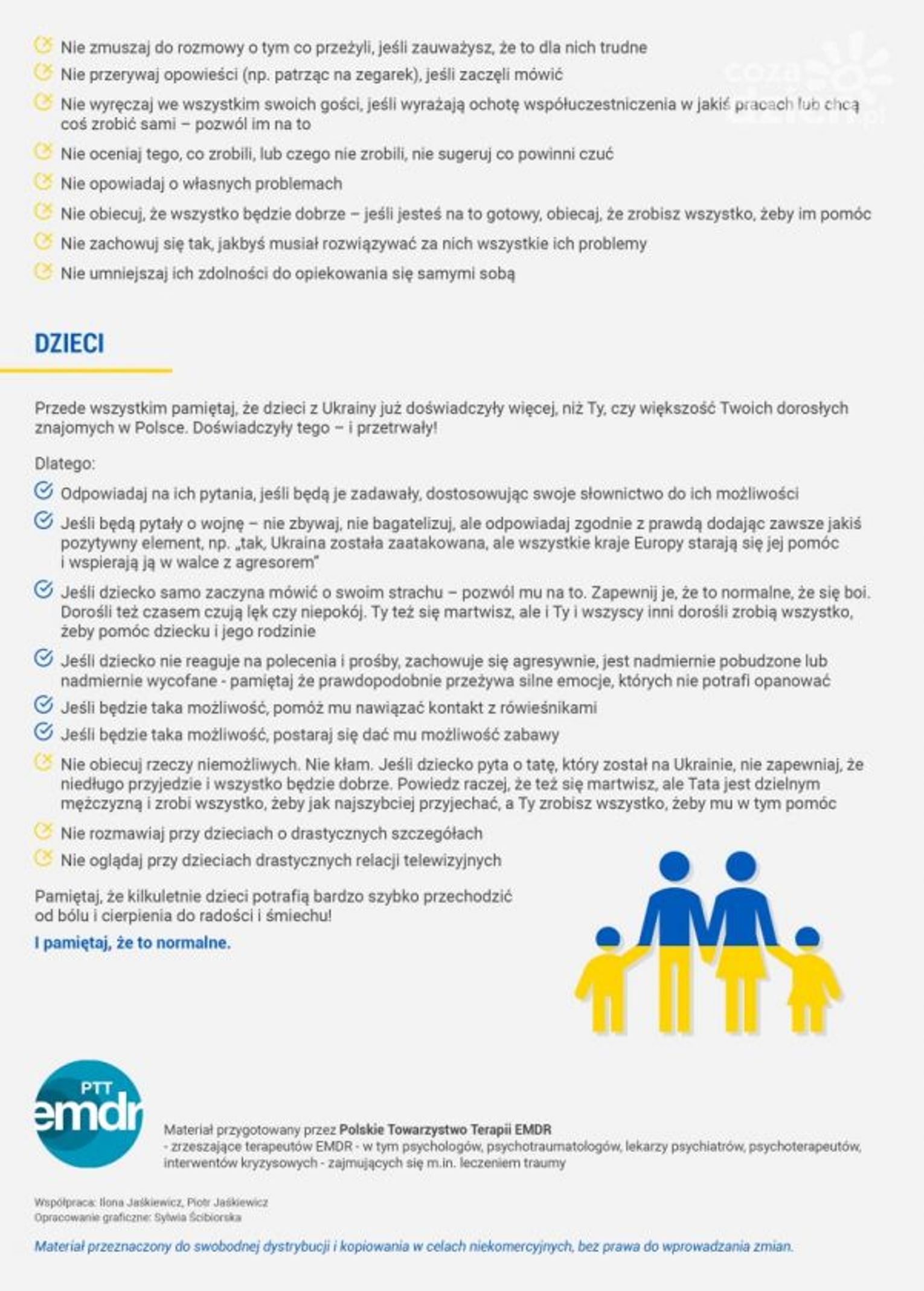 Znajdują się tam najważniejsze informacje jak kontaktować się z osobami, które często przeżyły już dramaty wywołane działaniami wojennymi na Ukrainie. Poradnik daje wskazówki jak powinny przebiegać rozmowy zwłaszcza z dziećmi. Zalecenia opracowało Polskie Towarzystwo Terapii EMDR - skupiające psychologów i specjalistów w zakresie interwencji kryzysowej i leczenia traumy. Wskazówki umieszczone są na ulotkach, które można wydrukować. Szczegółowe informacje na temat tego poradnika dostępne są też na stronie https://emdr.org.pl/wp-content/uploads/2022/03/Jak-rozmawiac-z-rodzinami-z-Ukrainy-wysoka-jakosc.pdf
