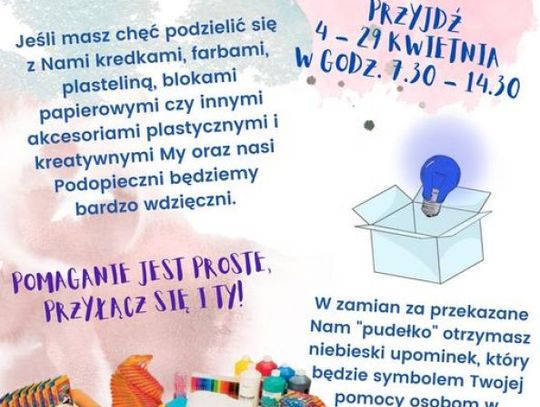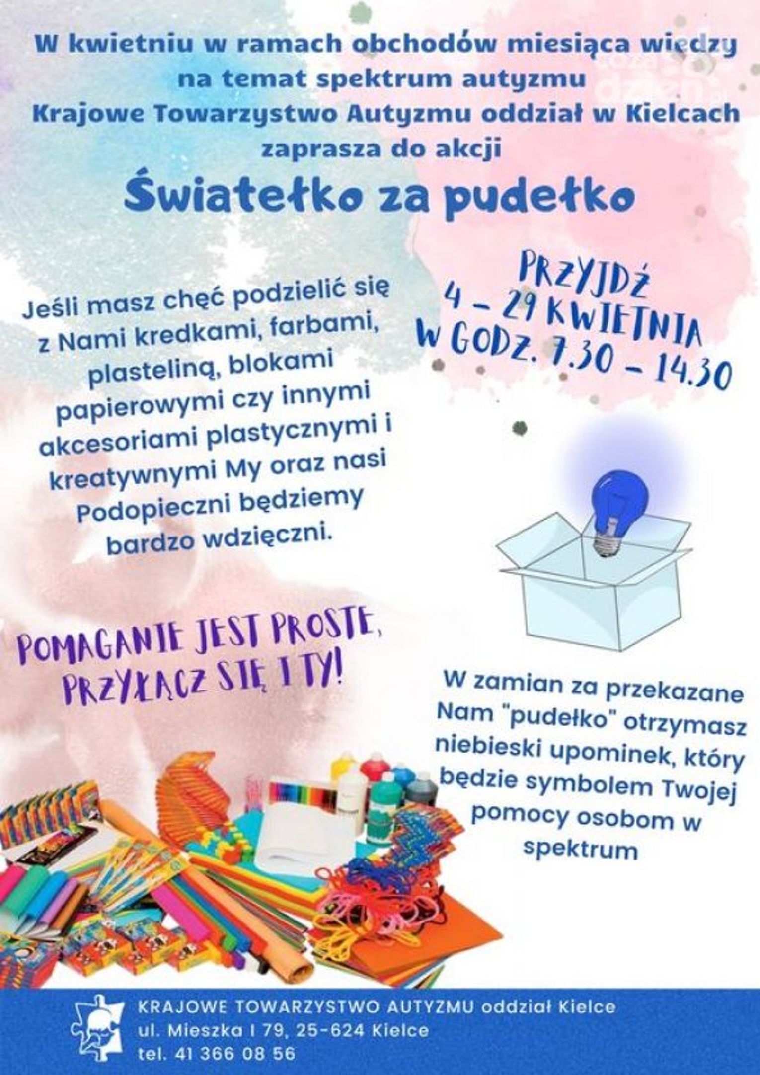 „Tradycyjnie ruszamy z akcją „Światełko za pudełko”. W poprzednich edycjach otrzymaliśmy od Was mnóstwo cudownych gier, klocków oraz puzzli, z których skorzystali nasi podopieczni, zarówno dzieci, jak i dorośli. Wasze zaangażowanie przeszło nasze najśmielsze oczekiwania, okazaliście się hojni i wspaniali, za co jesteśmy ogromnie wdzięczni. Ze względu na to, że podarowanych pomocy jest tak wiele, tym razem chcielibyśmy zmienić charakter naszej zbiórki i prosić Was o artykuły plastyczno-kreatywne. Zarówno uczestnicy Środowiskowego Domu Samopomocy, jak i podopieczni naszej Poradni uwielbiają zajęcia plastyczne. Ze względu na to, że artykuły papiernicze i plastyczne szybko się zużywają i niszczą – z chęcią przyjmiemy nowe lub używane pomoce w postaci kredek, farb, pędzelków, plasteliny, bloków rysunkowych i technicznych, bibuły, artykułów kreatywnych itp. Wszystkie otrzymane materiały zostaną przekazane na użytek podopiecznych Poradni oraz ŚDS dla Osób z Autyzmem KTA o/Kielce.”, informuje na swoim profilu facebookowym KTA Oddział Kielce.