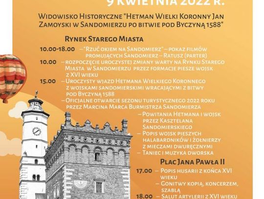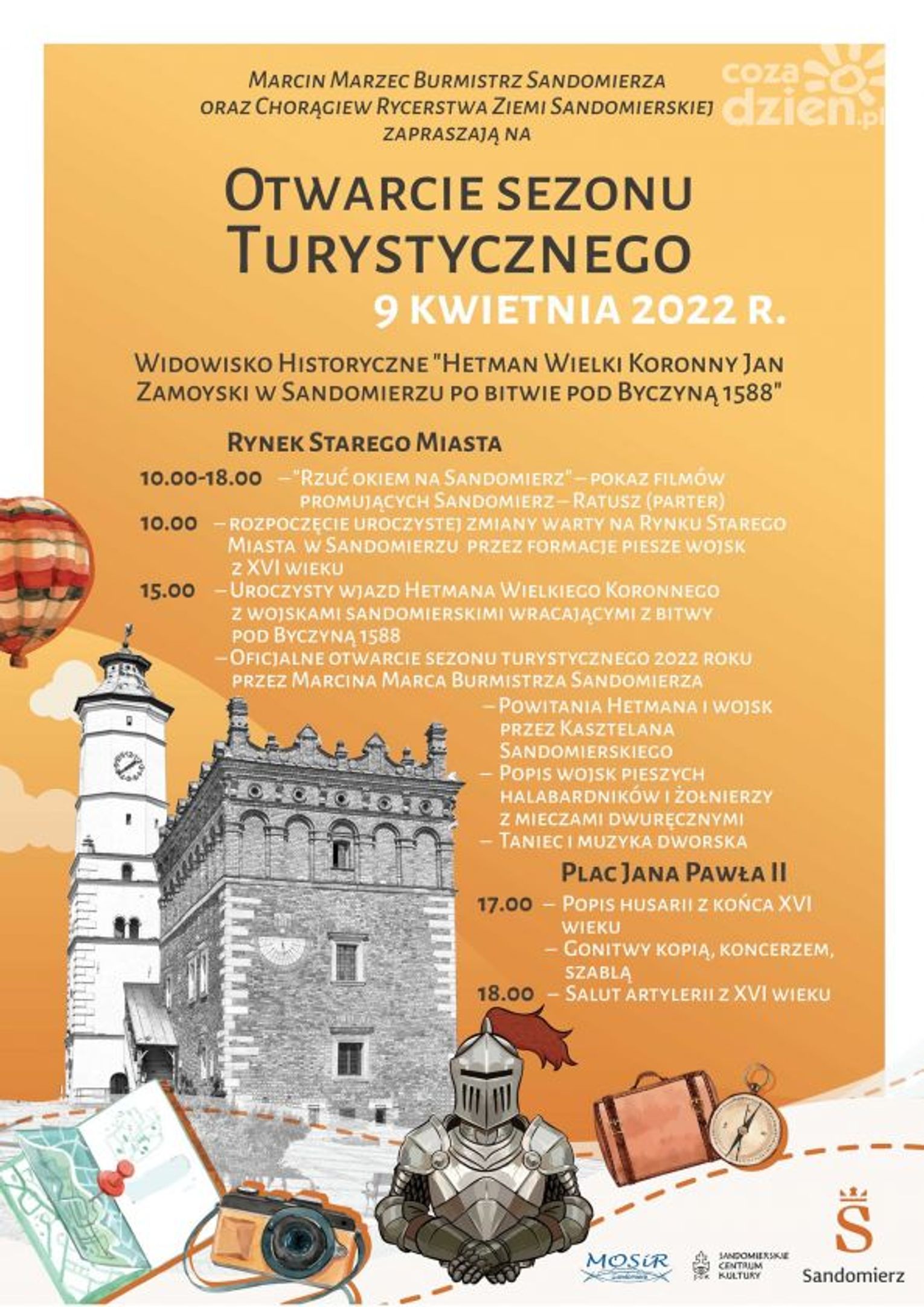 Otwarcie Sezonu turystycznego w Sandomierzu - zaprasza Burmistrz Marcin Marzec i Chorągiew Rycerstwa Ziemi Sandomierskiej. 9 Kwietnia na rynku sandomierskim widowisko historyczne, rozpoczęcie uroczystej zmiany warty, uroczyste otwarcie sezonu turystycznego przez Burmistrza Marcina Marca.