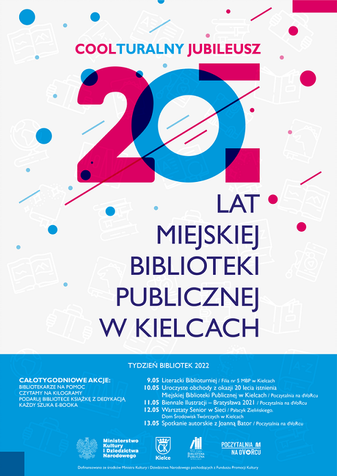 W programie wydarzenia przewidziano m.in. uroczyste wręczenie pracownikom MBP odznak „Zasłużony dla Kultury Polskiej”, uhonorowanie najlepszych czytelników, wystawę pn. „20-lecie MBP w Kielcach” i Biennale Ilustracji Bratysława 2021, turniej dla uczniów kieleckich szkół, a także spotkanie autorskie z pisarką, Joanną Bator. 12 maja bibliotekarze zaangażują się w szczytną akcję, podczas której obdarują książkami dzieci z Ukrainy, pacjentów szpitala i przychodni rejonowych, a także pasażerów kieleckich dworców.