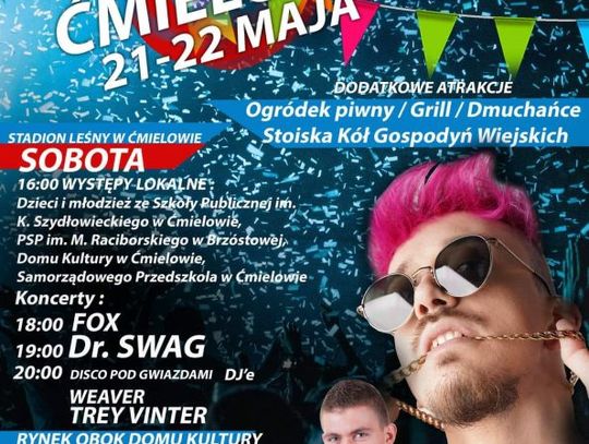 Już w ten weekend 21 i 22 maja odbędą się Dni Ćmielowa. Na imprezę za pośrednictwem Radia Rekord Świętokrzyskie 89,6 FM zaprasza burmistrz Ćmielowa Joanna Suska. Na pierwszy dzień zaplanowane są występy lokalnych artystów, koncert zespołu FoX oraz gwiazda wieczoru, którą jest Dr. SWAG. W niedzielę odbędzie się I Ćmielowski Przegląd Kapel Weselnych.