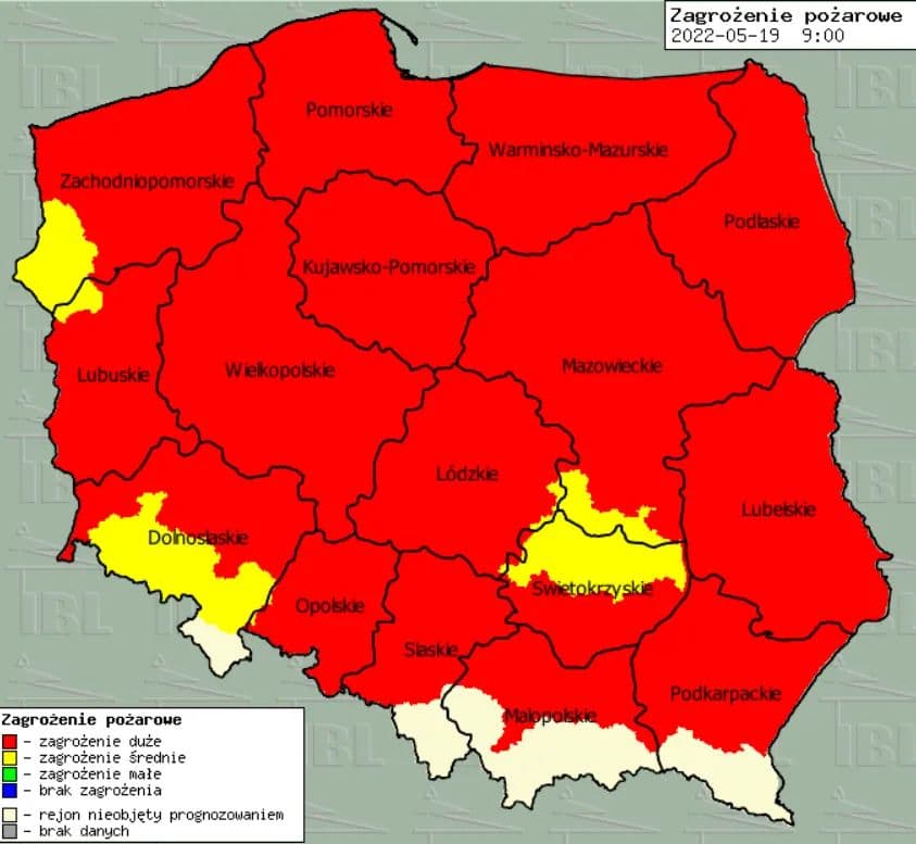 Z aktualizowanej na bieżąco mapy zagrożenia pożarowego wynika, że w większości kraju jest wydany nawyższy III stopień zagrożenia. Do 10 maja w całym kraju było aż 547 pożarów lasów. Jak mówi Wojciech Nadziałek ze Storm Chasers Świętokrzyskie, sytuacja w najbliższym czasie się nie poprawi. "W weekend przez nasz region przejdzie front atmosferyczny z burzami i opadami deszczu. Jednak te opady, które mogą być intensywne, nie uzupełnią braków wody gruntowej".