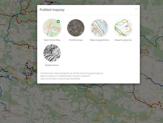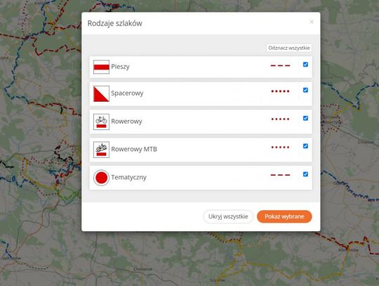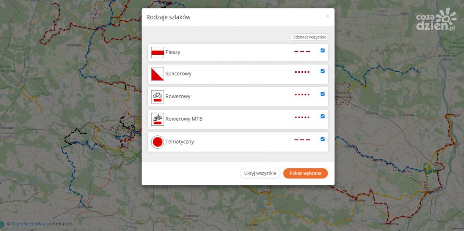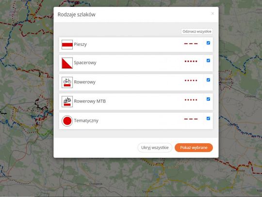 W kolejnej zakładce możemy wybrać, które z miejsc nas interesują, by były zaznaczone na mapie. Do wyboru punkty przyrodnicze, kulturalne, widokowe i np. agroturystyczne. Możemy też zmierzyć odległość z punktu a do punktu b czy wybrać rodzaj mapy, jaki ma być wyświetlany.