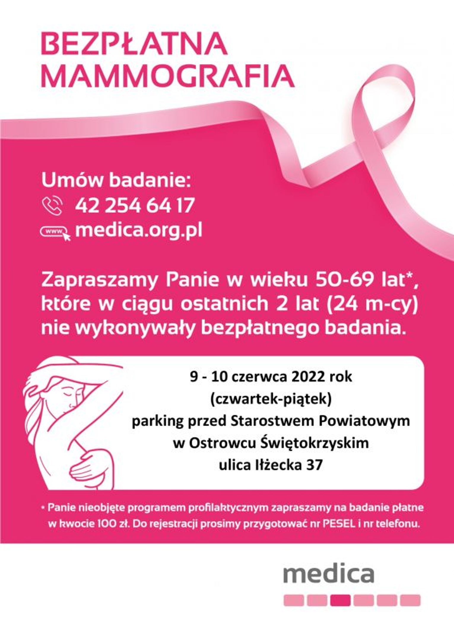 Badania będzie można wykonać w czwartek i piątek 9 i 10 czerwca w mammobusie zaparkowanym przy siedzibie starostwa powiatowego w Ostrowcu przy ulicy Iłżeckiej 37.