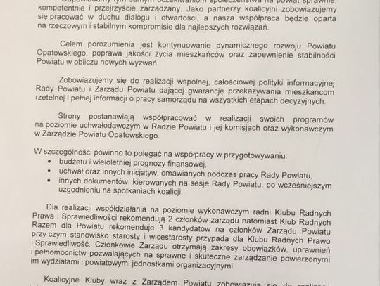 Koalicyjne porozumienie programowe Rady Powiatu opatowskiego, klubów Prawa i Sprawiedliwości oraz Razem dla Powiatu, będzie obowiązywać do końca kadencji samorządu 2018-2023.