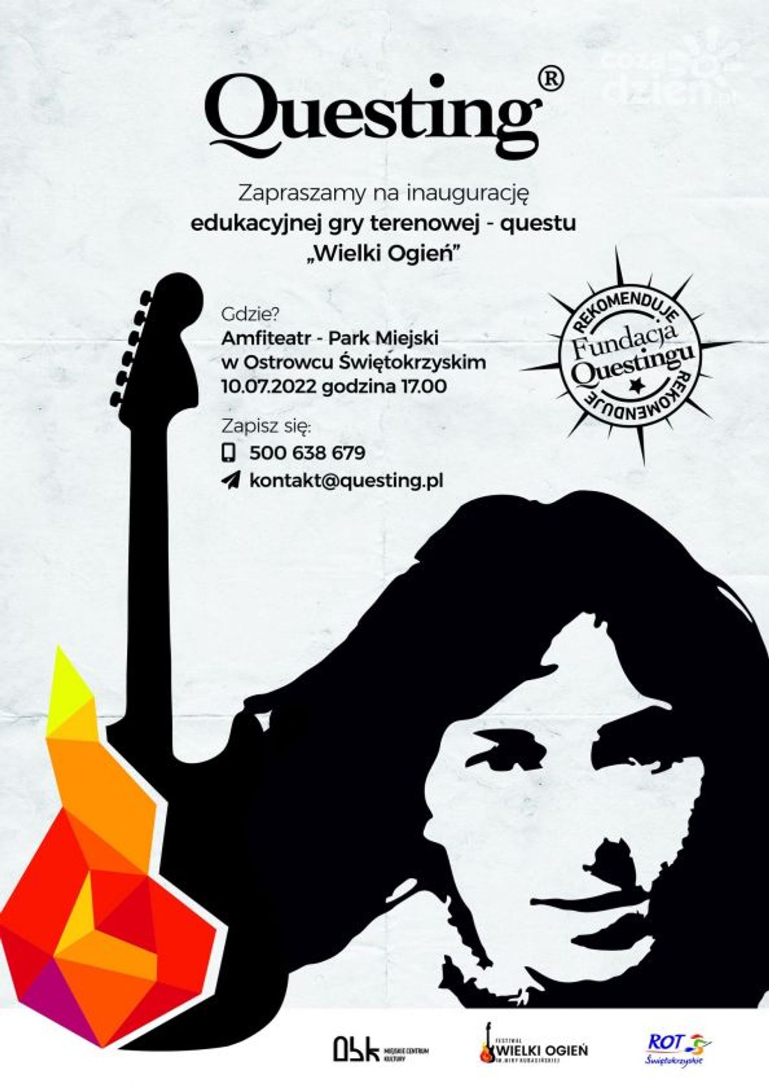 Miejskie Centrum Kultury w Ostrowcu Świętokrzyskim, Regionalna Organizacja Turystyczna Województwa Świętokrzyskiego oraz Fundacja Questingu zapraszają na inaugurację edukacyjnej gry terenowej - questu "Wielki Ogień 10.07.2022 godzina 17.00 (Amfiteatr - Park Miejski w Ostrowcu Świętokrzyskim) podczas XV Festiwalu Wielki Ogień im. Miry Kubasińskiej w Ostrowcu Świętokrzyskim. Rozwiąż zagadki i dowiedz się więcej o patronce festiwalu. Zapraszamy do zapisów pod numerem telefonu 500 638 679