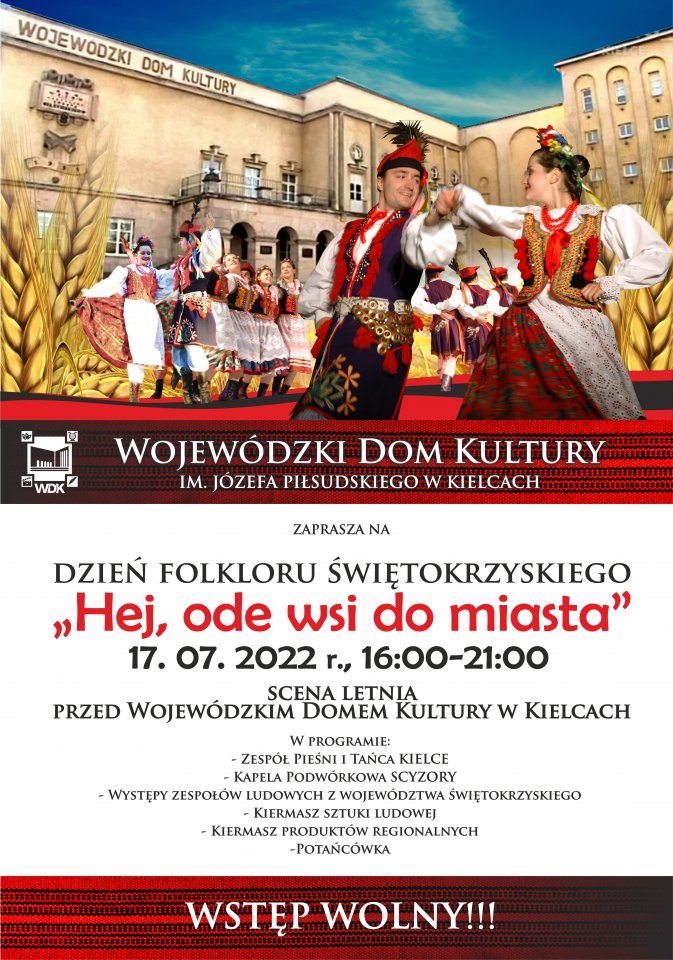 Na scenie letniej WDK zaprezentują się zespoły ludowe z naszego regionu, które zapoznają nas z tradycjami i obyczajami ludowymi. W programie przewidziano między innymi występy Kapeli Podwórkowej „Scyzory” oraz Zespołu Pieśni i Tańca „Kielce.
