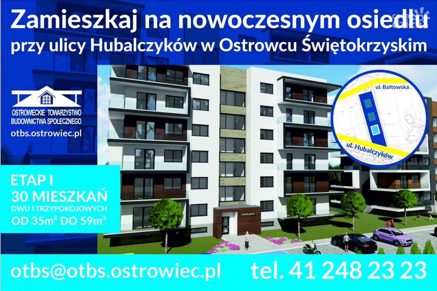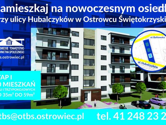 Przy ul. Hubalczyków w Ostrowcu Świętokrzyskim powstanie nowe osiedle. Inwestycje zrealizuje Ostrowieckie Towarzystwo Budownictwa Społecznego Spółka z o.o. Wybudowane zostaną 3 bloki z mieszkaniami o powierzchni od 35 do 59 metrów kwadratowych.