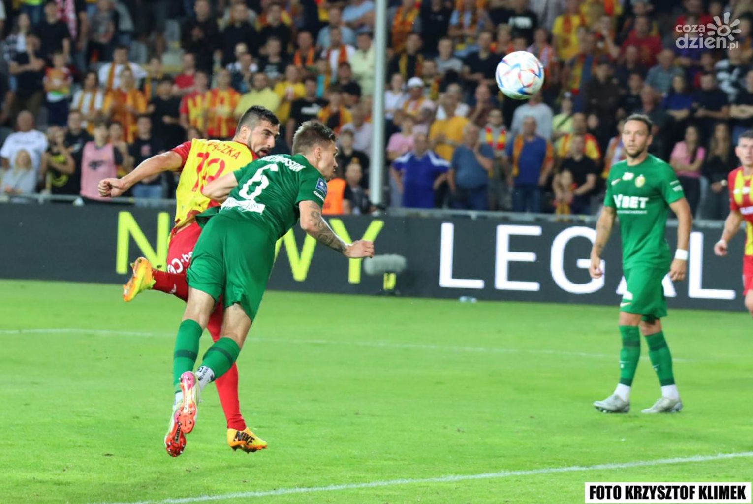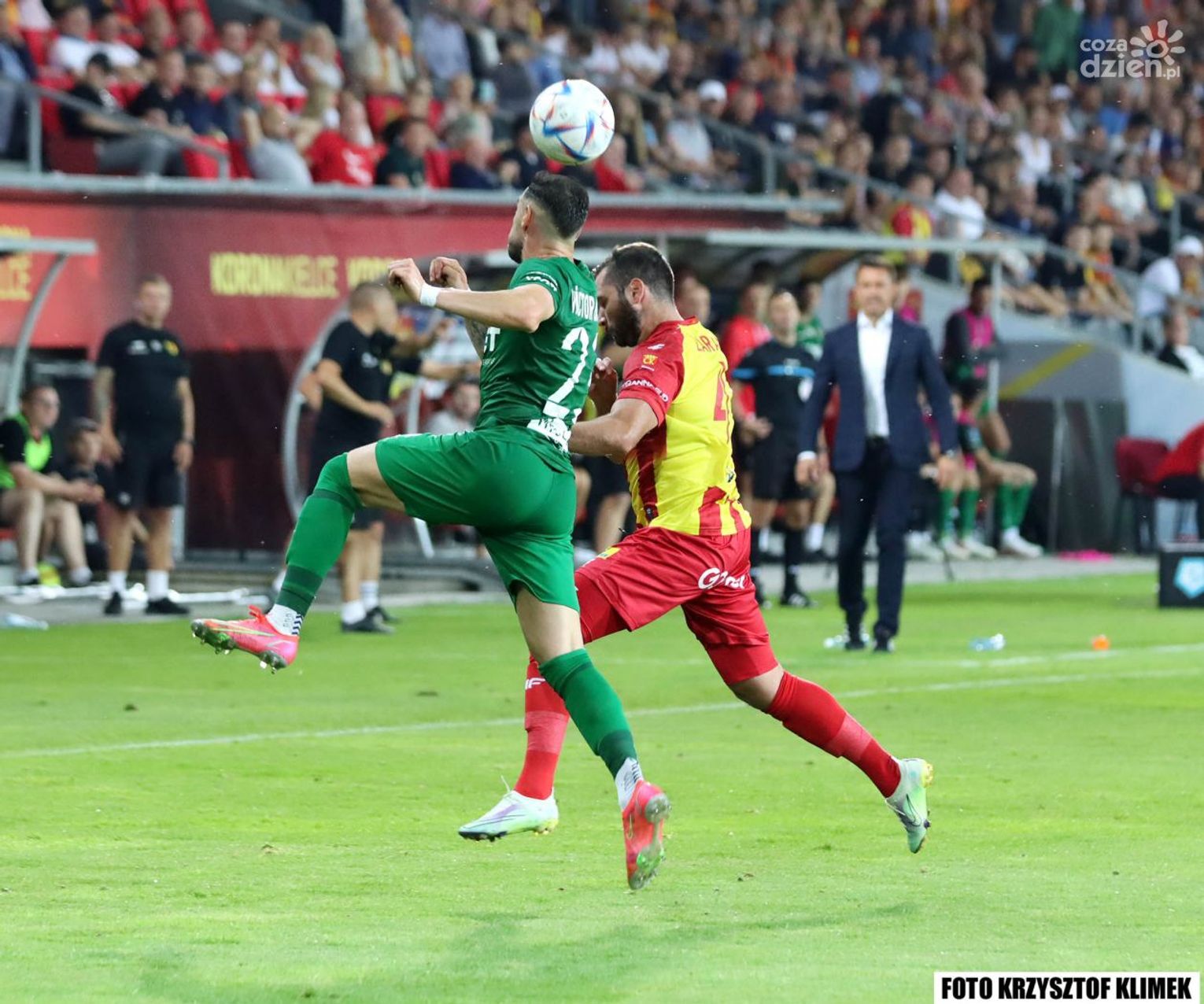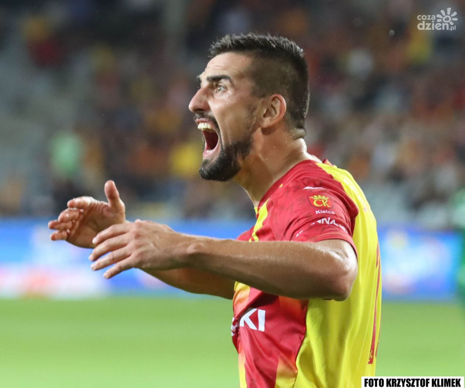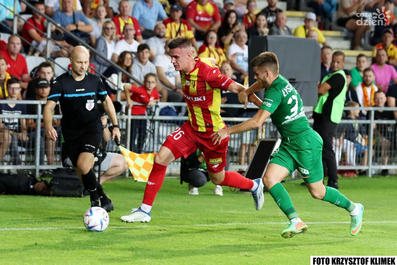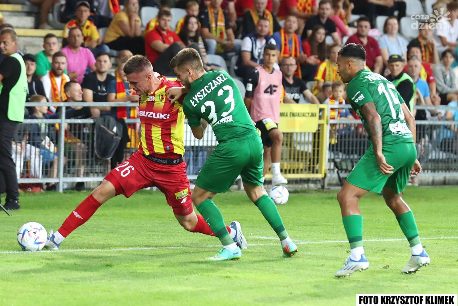 W poprzednim spotkaniu Korona miała problem z utrzymywaniem się przy piłce, nie wychodziło też zakładanie pressingu. Tym razem wyglądało to o niebo lepiej, a kielecka drużyna grała z werwą. W 27 minucie gospodarze objęli prowadzenie. Po rozegraniu piłki na prawej flance Takaca z Dankiem świetną finalizacją wykazał się Śpiączka. W odpowiedzi groźnie z dystansu strzelał Dennis Jastrzembski, ale piłkę odbił Konrad Forenc (z opaską kapitana).