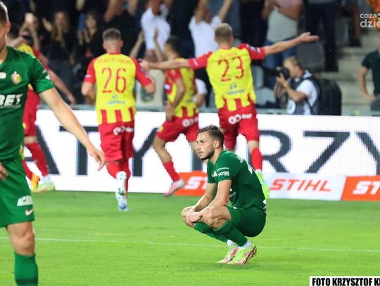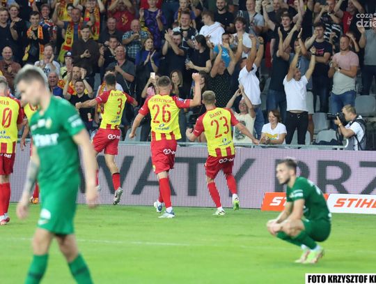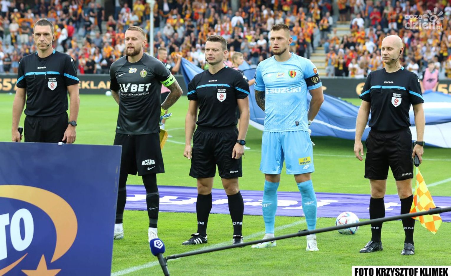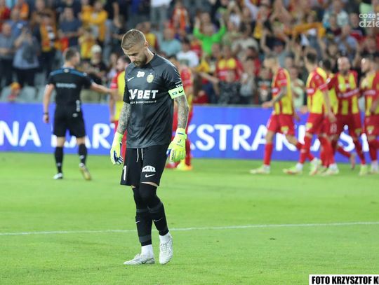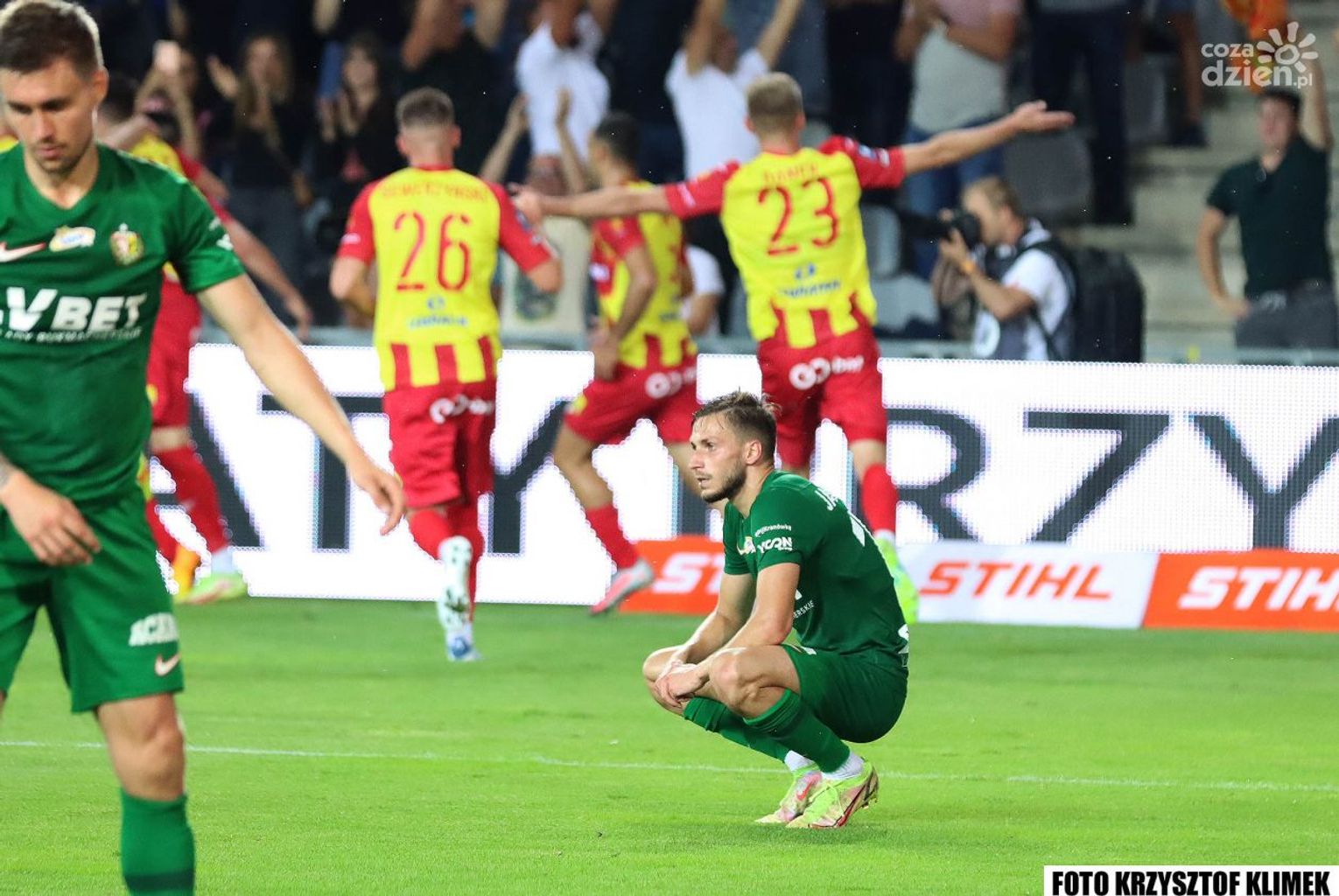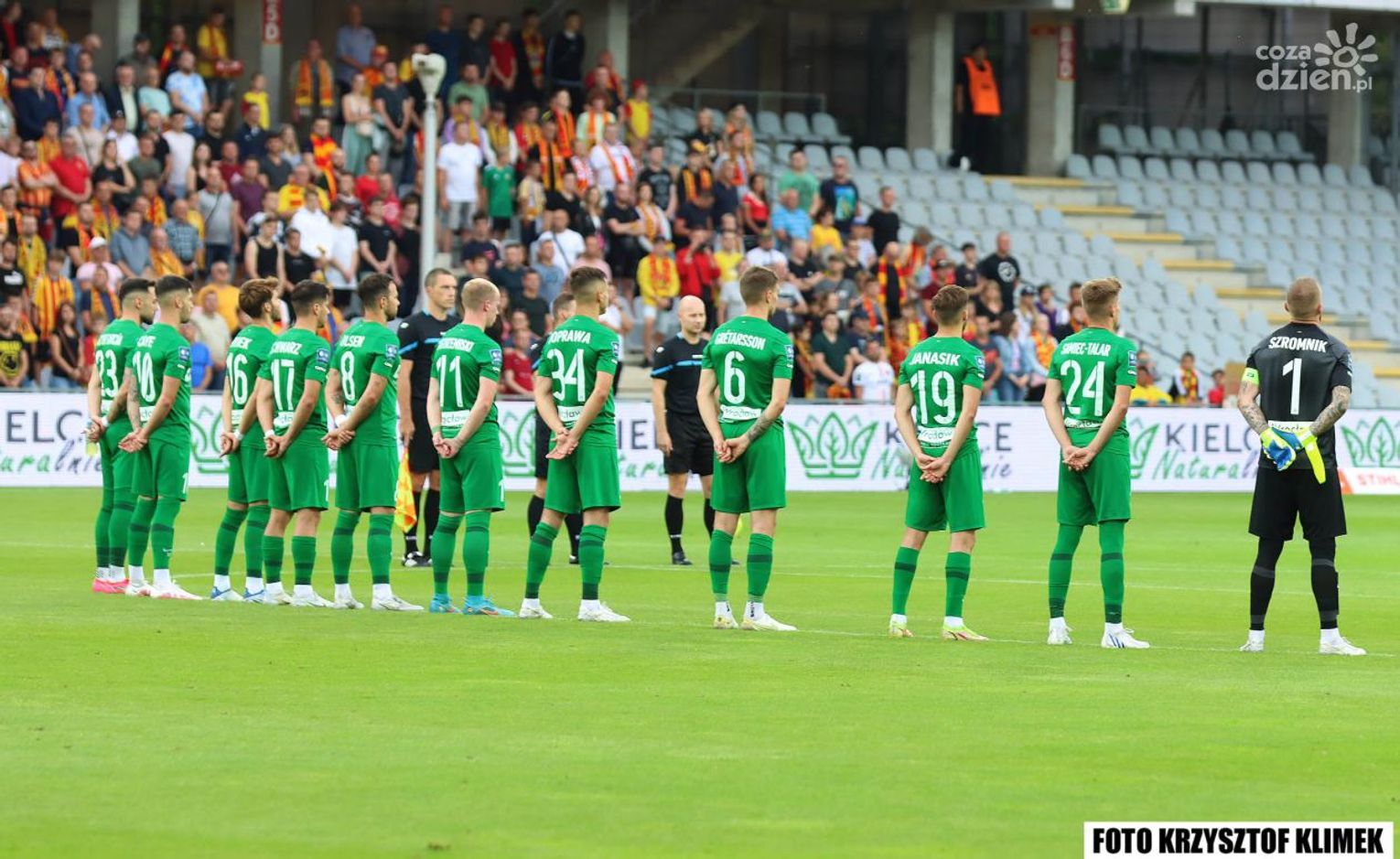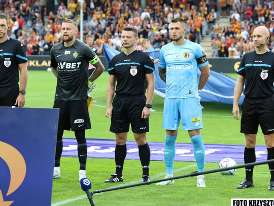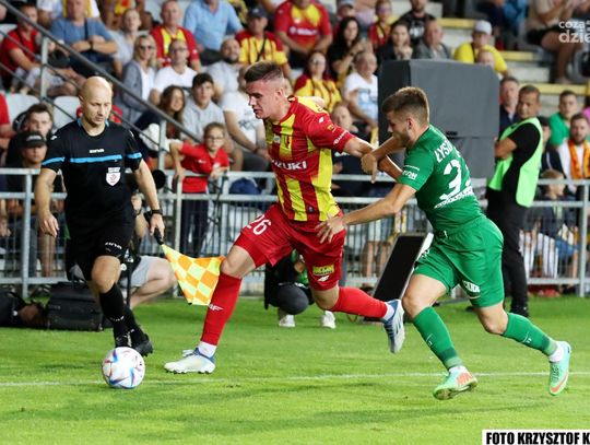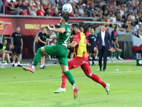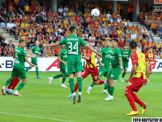 W poprzednim spotkaniu Korona miała problem z utrzymywaniem się przy piłce, nie wychodziło też zakładanie pressingu. Tym razem wyglądało to o niebo lepiej, a kielecka drużyna grała z werwą. W 27 minucie gospodarze objęli prowadzenie. Po rozegraniu piłki na prawej flance Takaca z Dankiem świetną finalizacją wykazał się Śpiączka. W odpowiedzi groźnie z dystansu strzelał Dennis Jastrzembski, ale piłkę odbił Konrad Forenc (z opaską kapitana).