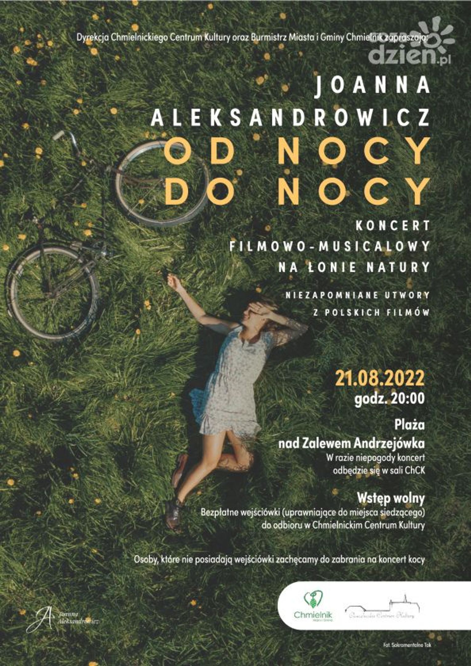 Dyrekcja Chmielnickiego Centrum Kultury oraz Burmistrz Miasta i Gminy Chmielnik zapraszają na koncert filmowo-musicalowy "OD NOCY DO NOCY" Joanny Aleksandrowicz, który odbędzie się na łonie natury nad Zalewem "Andrzejówka", dnia 21 sierpnia 2022r. (NIEDZIELA), o godzinie 20:00. Serdecznie zapraszamy!