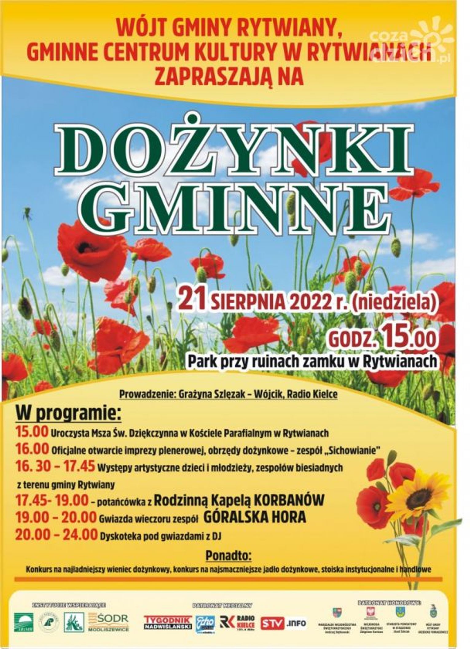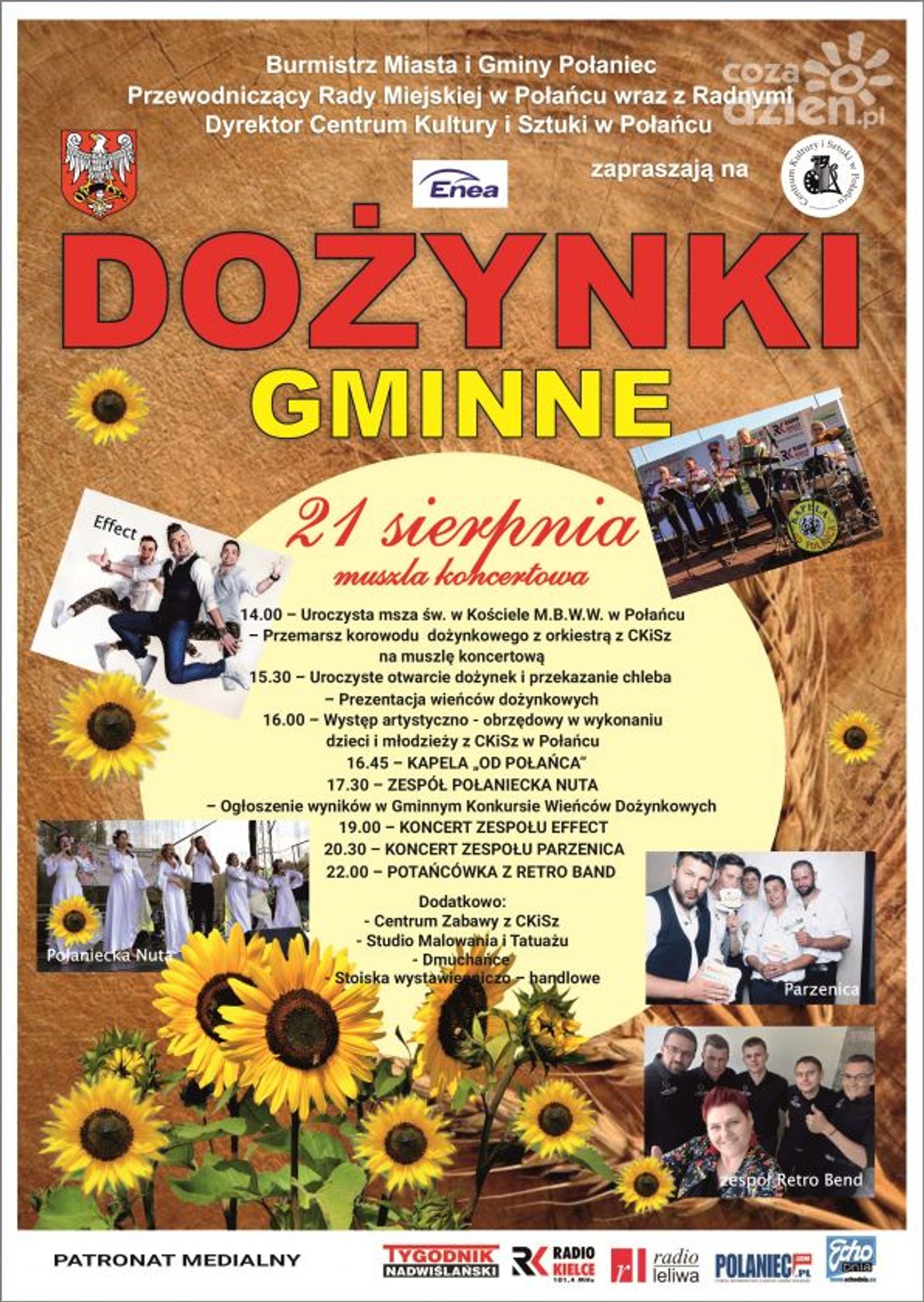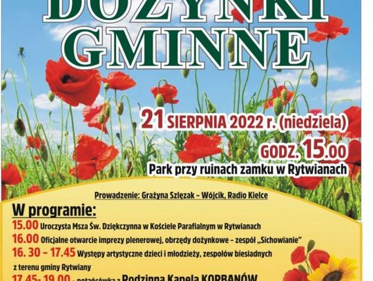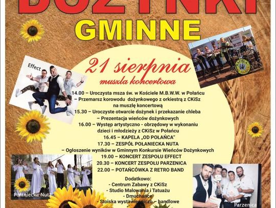 Szczegóły: https://www.centrum.polaniec.pl/harmonogram-imprez/details/2022-08-21/105-dozynki-gminne