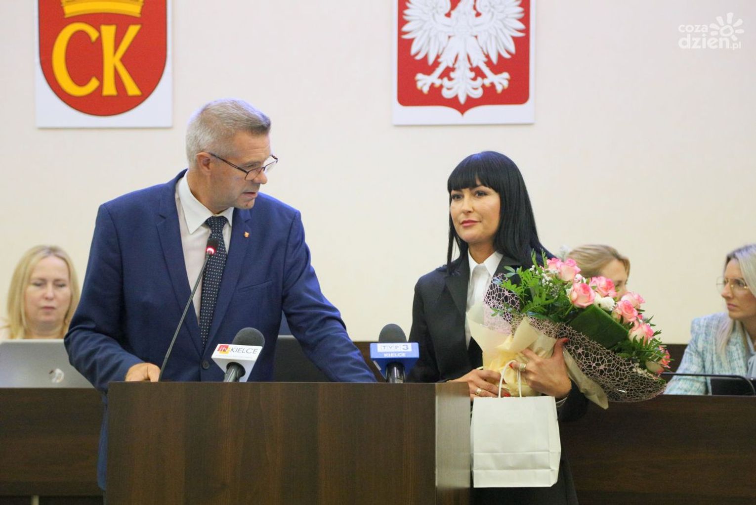 Nowa skarbnik Miasta Kielce została przywitana na nowym stanowisku bukietem kwiatów i życzeniami.