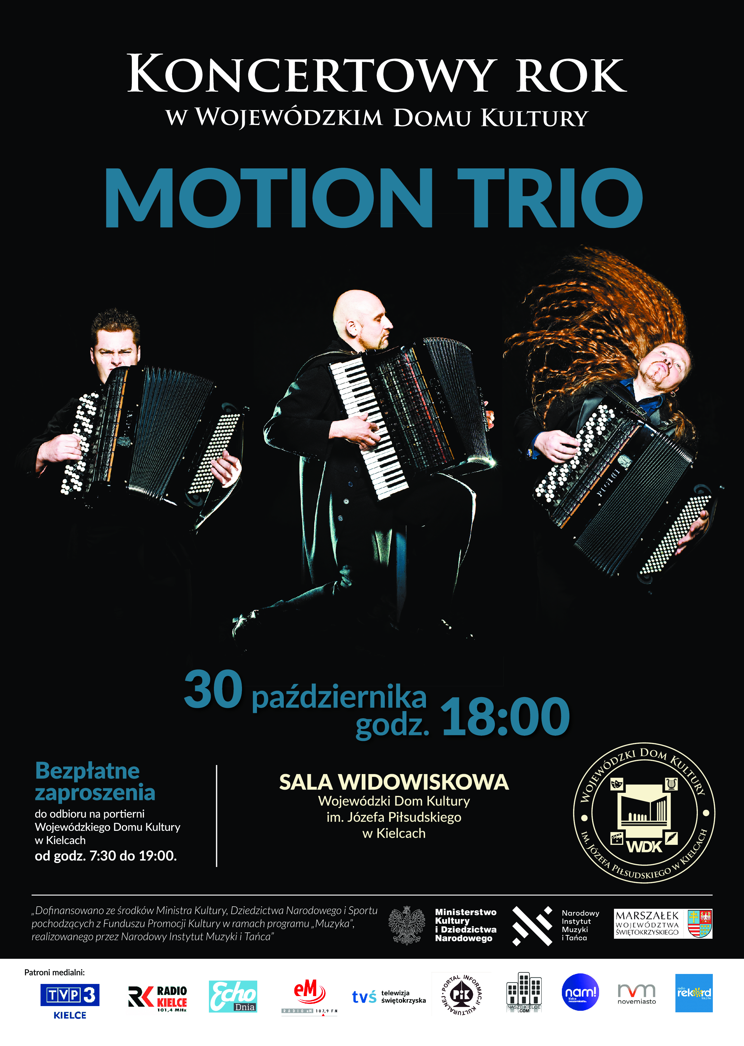 "Motion Trio" – polskie trio akordeonowe, łączące w swej twórczości ogień muzyki o korzeniach wschodnioeuropejskich z lodowatą precyzją wielkich kompozytorów klasycznych. Pełna pasji i namiętności muzyka Motion Trio została doceniona przez współczesnych mistrzów, takich jak: Michael Nyman, Wojciech Kilar, Krzysztof Penderecki, Jerzy Maksymiuk, Bobby McFerrin czy Joe Zawinul. Oryginalny repertuar Motion Trio zawdzięcza autorskim kompozycjom artystów tworzących zespół, w głównej mierze lidera - Janusza Wojtarowicza oraz Pawła Baranka i Marcina Gałażyna. Założony ponad dwadzieścia pięć lat temu zespół przeszedł swą artystyczną drogę od koncertów na ulicach Europy po największe koncertowe sale świata, m.in.: nowojorską Carnegie Hall, Barbican Center w Londynie czy wiedeński Konzerthaus. Znakiem rozpoznawczym jest niezwykle oryginalne brzmienie tria, osiągane, co najważniejsze, przy zachowaniu dźwięku akordeonu: bez przetwarzania, bez udziału innych instrumentów, bez trików techniki. Artyści polegają jedynie na swojej doskonałej umiejętności gry na akordeonach, wyobraźni i talencie. Muzyka Motion Trio łączy w sobie minimal music, jazz, rock, folk, czyli „motion music” definiowane przez Janusza Wojtarowicza jako „muzyka, która poszukuje nowych dźwięków, nowych możliwości gry na akordeonie, nowego spojrzenia na niewykorzystany dotąd fascynujący instrument”. Trzynaście albumów wydanych do tej pory przez zespół zdobyło szerokie uznanie, zbierając pochwały i nagrody zarówno krytyków muzyki jazzowej, jak i klasycznej. Motion Trio wystąpiło w czterdziestu czterech krajach świata na wszystkich kontynentach. Zespól gra na instrumentach Pigini Sirius Millenium, uważanych za najlepsze akordeony na świecie.