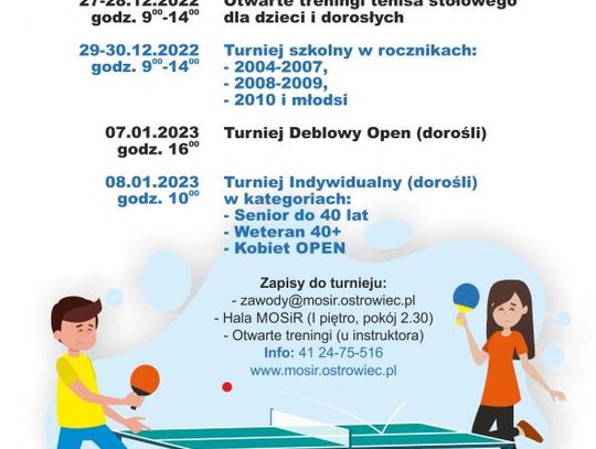 Dorośli przystąpią do rywalizacji przy stołach już w nowym roku. Turniej deblistów zaplanowano na sobotę 7 stycznia od godziny 16. Zmagania singlistów zaplanowane zostały natomiast na niedzielę 8 stycznia od godziny 10. Podobnie jak w poprzednich edycjach turnieju rywalizacja singlistów odbywać się będzie w trzech kategoriach wiekowych. Mężczyźni podzieleni zostaną na dwie grupy - do 40 roku życia (osoby, które do 8 stycznia 2023 nie ukończyły 40 lat) oraz 40+ (40-latkowie i starsi), natomiast kobiety zagrają w jednej grupie open. Zgłoszenia, zarówno do turnieju indywidualnego jak i deblowego, można składać do dnia 05.01.2023r. (do godziny 12.00) w Dziale Organizacji Imprez i Marketingu Miejskiego Ośrodka Sportu i Rekreacji w Ostrowcu Świętokrzyskim przy ul. Świętokrzyska 11 (pokój 2.30) lub pocztą elektroniczną na adres [email protected] oraz w dniu zawodów przy wejściu do hali do pół godziny przed rozpoczęciem turnieju. Formularz zgłoszenia można pobrać ze strony www.mosir.ostrowiec.pl. Turniej przeprowadzony zostanie zgodnie z przepisami gry w tenisa stołowego, wydanymi przez Polski Związek Tenisa Stołowego. Ostateczny system rozgrywek w poszczególnych konkurencjach uzależniony będzie od ilości zgłoszonych osób i ustalony zostanie po zebraniu zgłoszeń.