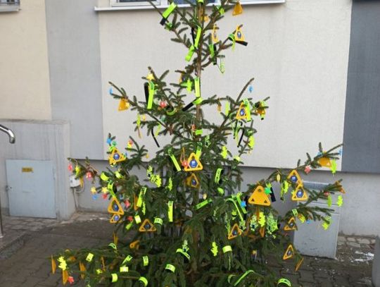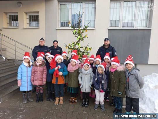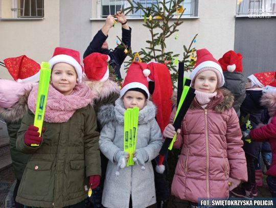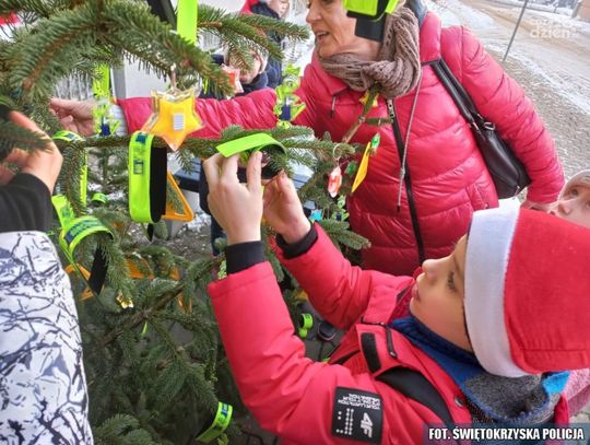 W dekorowaniu policyjnej odblaskowej choinki mundurowym pomogły dzieci ze Szkoły Podstawowej nr 1 w Pińczowie.