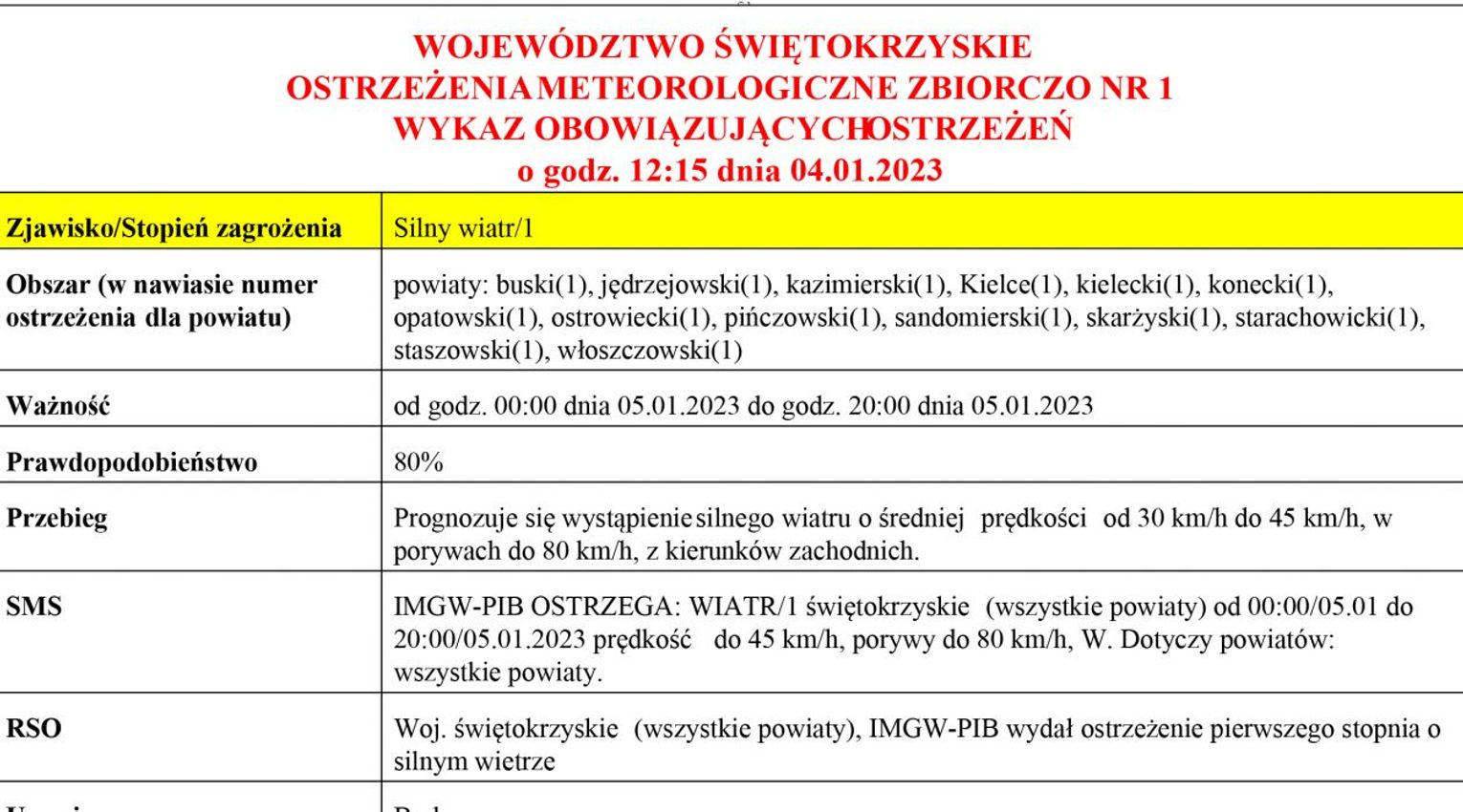 "Przez cały dzień możliwe będą opady deszczu o zmiennym natężeniu, największe podczas przechodzenia komórek konwekcyjnych. Zagrożeniem będą też silne porywy wiatru do 80 km/h" - mówi Wojciech Nadziałek z grupy Storm Chasers Świętokrzyskie.