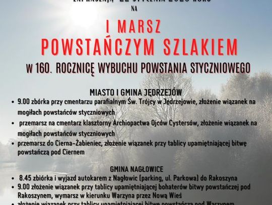 Zapraszamy wszystkich chętnych do udziału w „I-szym Marszu Powstańczym Szlakiem”, który odbędzie się 22 stycznia 2023 r. z okazji 160. rocznicy wybuchu powstania styczniowego. Rajd ma charakter międzygminny. Grupa jędrzejowska zbierze się pod cmentarzem parafialnym Św. Trójcy o godzinie 9:00. Złoży wiązanki kwiatów na mogiłach powstańców, a następnie wyruszy na cmentarz klasztorny i dalej, do Cierna – Żabieńca. Grupa nagłowicka zbiera się o 8:45 i wyrusza autokarem do Rakoszyna, gdzie rozpocznie trasę przemarszu przez Warzyn, aż do Cierna Żebieńca, gdzie wspólnie z grupą jędrzejowską złoży wiązanki pod tablicą upamiętniającą bitwę pod Ciernem. Udział w rajdzie jest bezpłatny. Trasa wiedzie częściowo drogami publicznymi, dlatego uczestnicy są zobowiązani do przestrzegania przepisów ruchu drogowego. Uczestnicy niepełnoletni mogą brać udział w rajdzie wyłącznie pod opieką osoby pełnoletniej.