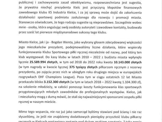Miasto Kielce, jak i ja - Bogdan Wenta, jako wybrany głosem zdecydowanej większości jego mieszkańców prezydent, podejmowaliśmy liczne działania, które wspierały funkcjonowania Klubu Sportowego piłki ręcznej niezależnie od nazwy, pod którą ten klub występował.