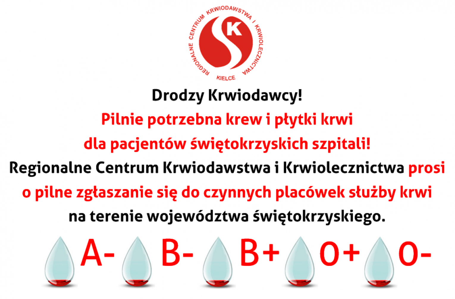 -"Obecnie brakuje grup A Rh-, B+,B-,0+ i 0-" - mówił Olgierd Oksza – Orski z Regionalnego Centrum Krwiodawstwa i Krwiolecznictwa w Kielcach.
