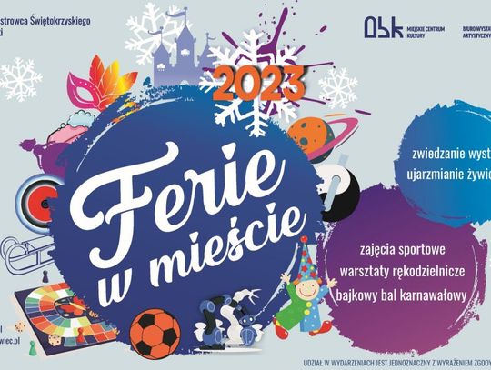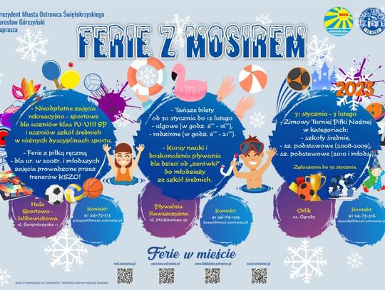 Codziennie od poniedziałku do piątku w godzinach 10-14 w Hali Sportowo – Widowiskowej przy ul. Świętokrzyskiej 11 odbywać się będą nieodpłatne zajęcia w ramach akcji „Ferie 2023 z MOSiRem.