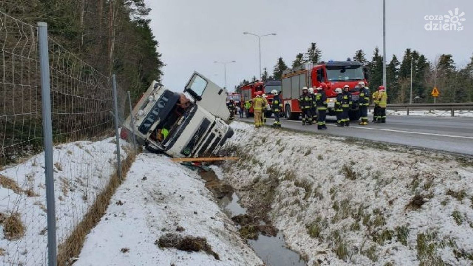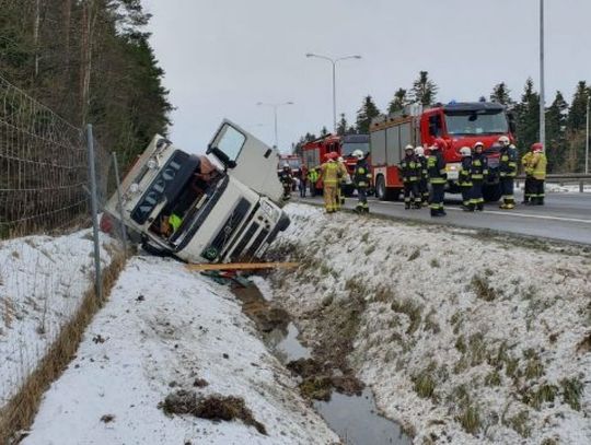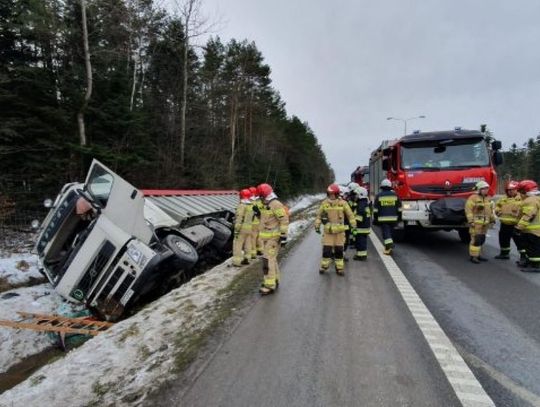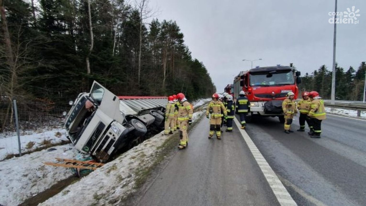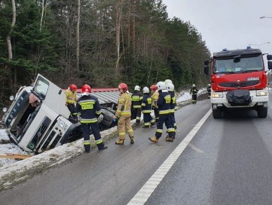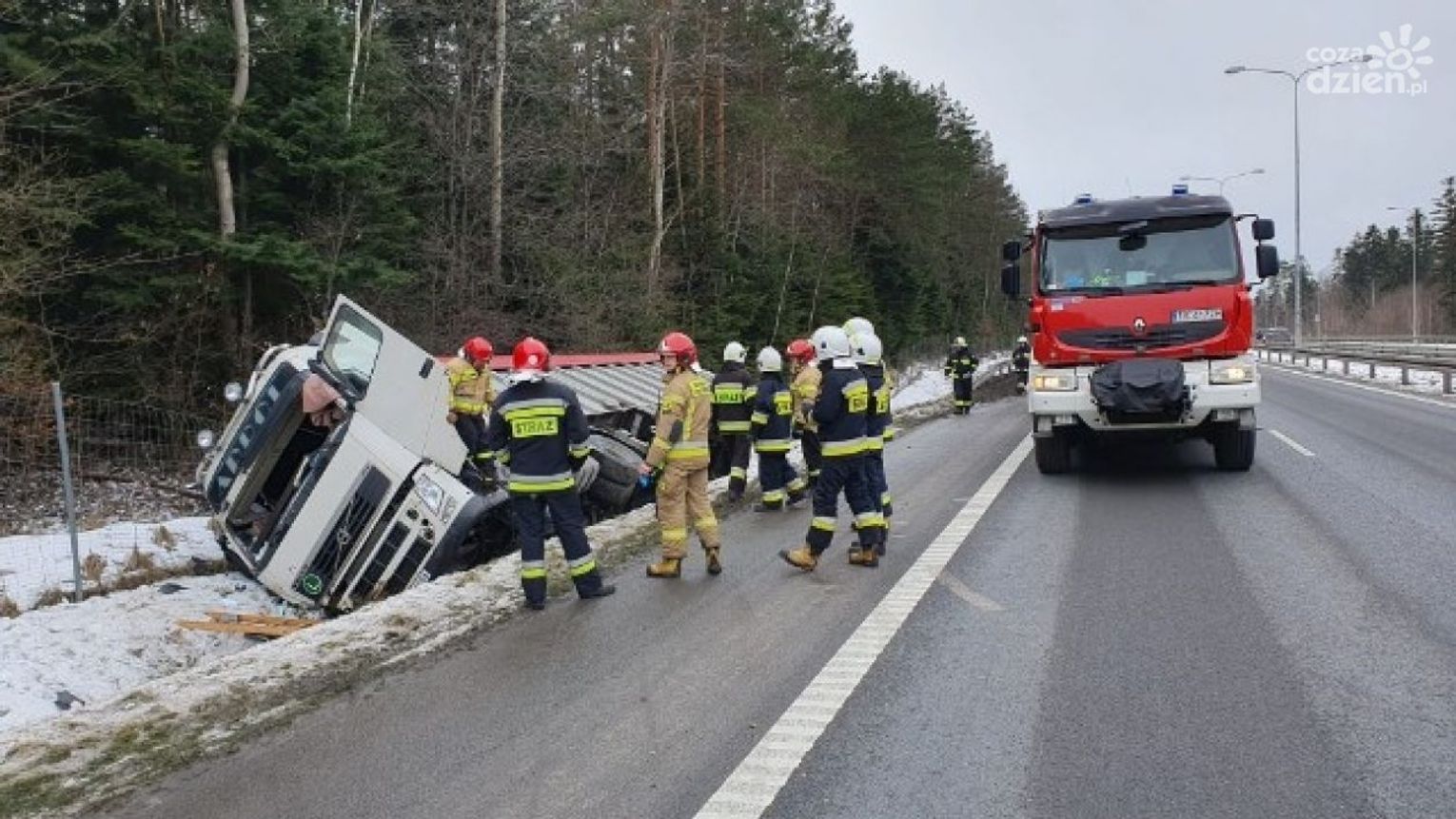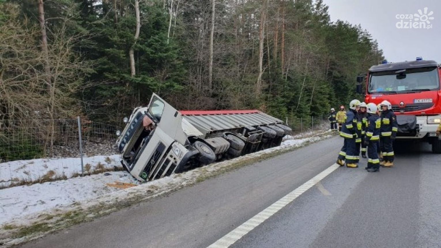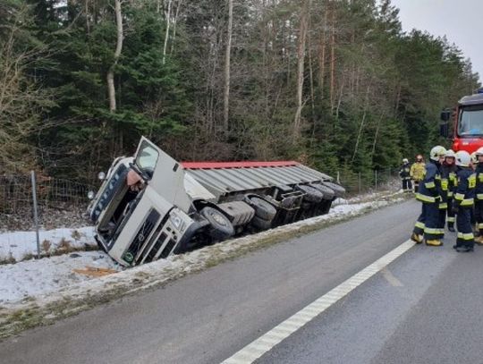 Zgłoszenie do miejscowości Barcza strażacy otrzymali po godz. 10.00. Po przybyciu na miejsce okazało się że tir leży w rowie a kierowca wymaga pomocy medycznej.