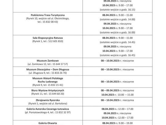 Za to nieczynne będą Muzeum Zamkowe, Zbrojownia, Muzeum Diecezjalne czyli Dom Długosza, Muzeum Historii Polskiego Ruchu Ludowego czy BWA.