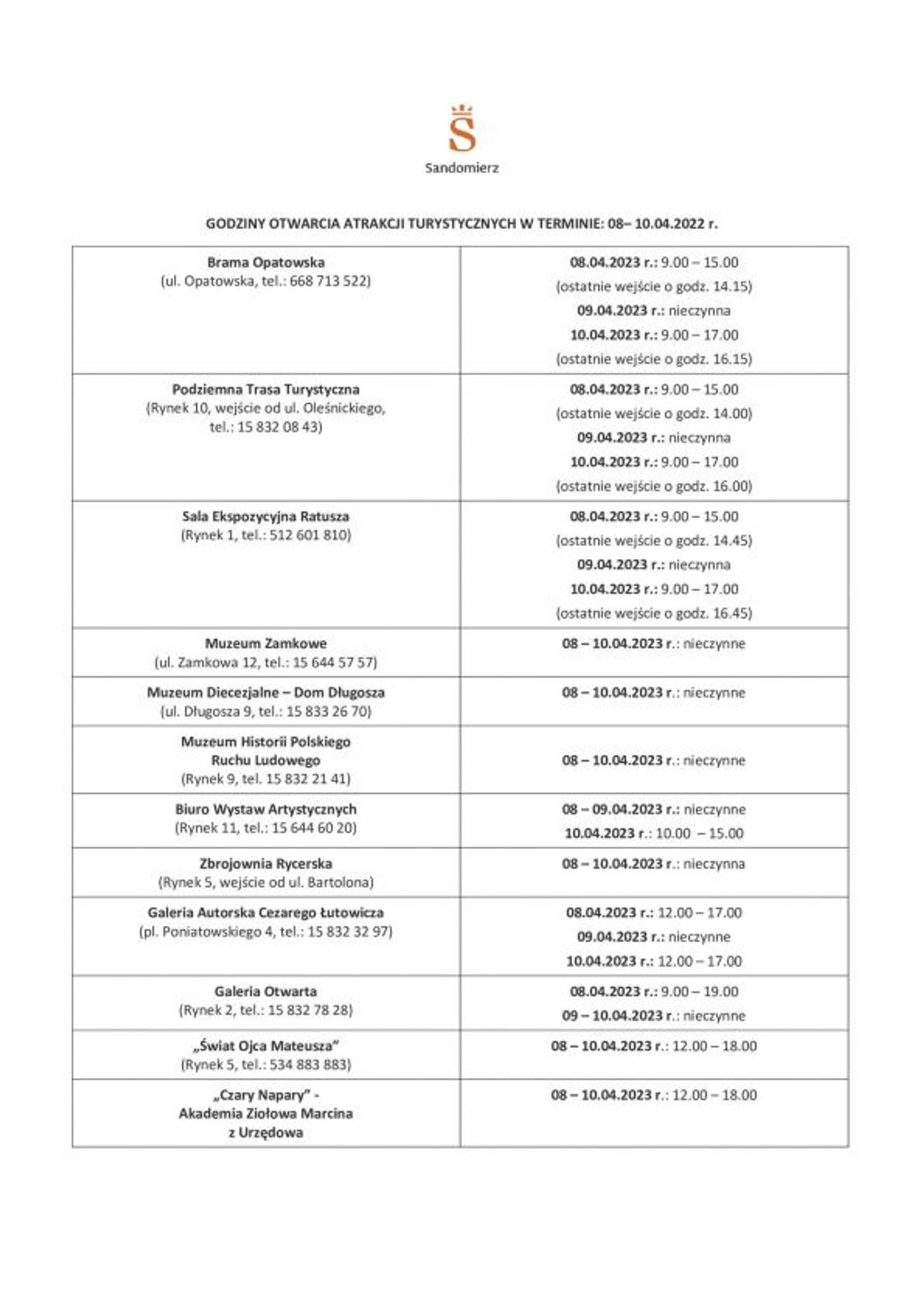 W drugi dzień świąt, czyli Lany Poniedziałek wstęp do tych sandomierskich atrakcji będzie w godzinach od 9 do 17, ale ostatnie wejścia zaplanowano na wcześniejsze godziny.