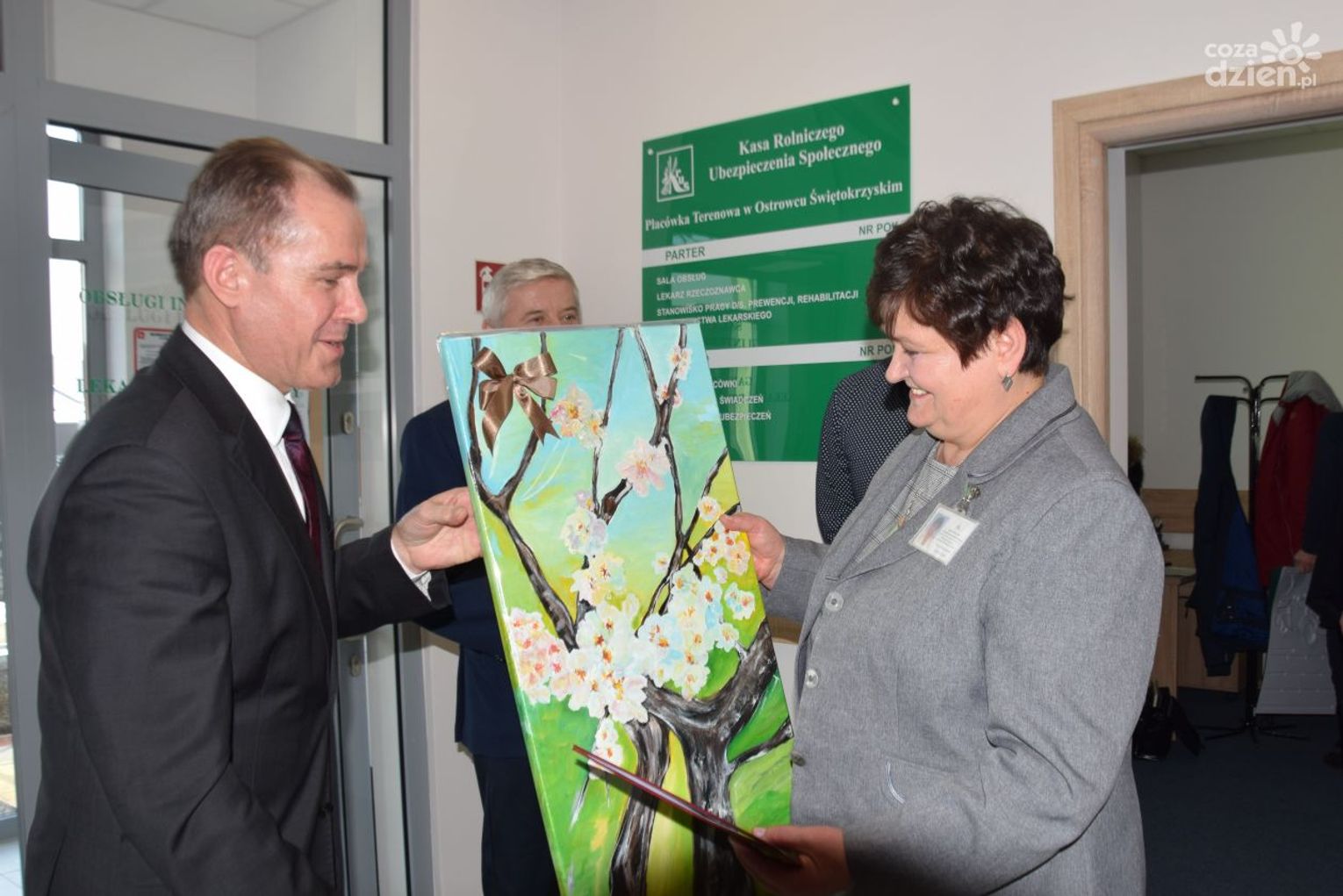 Jego uroczyste otwarcie odbyło się w poniedziałek, 28 stycznia z udziałem m.in. Aleksandry Hadzik, prezes Kasy Rolniczego Ubezpieczenia Społecznego i Tadeusza Jakubowskiego, dyrektora Oddziału Świętokrzyskiego KRUS. W wydarzeniu uczestniczyli również wicestarosta Andrzej Jabłoński, który na ręce Doroty Pietrzkiewicz - kierownik Placówki Terenowej KRUS w Ostrowcu Św. przekazał list gratulacyjny oraz piękny obraz, wykonany przez podopiecznych Warsztatów Terapii Zajęciowej przy ulicy Żabiej.