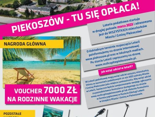 W celu zachęcenia mieszkańców do rozliczania się na terenie Miasta i Gminy Piekoszów postanowiono już po raz trzeci zorganizować loterię podatkową. Można w niej wygrać cenne nagrody, jak chociażby voucher o wartości 7 tysięcy złotych na rodzinne wakacje, telewizor, odkurzacz bezprzewodowy, hulajnoga elektryczna, generator pary, dwie karty na zakupy o wartości po tysiąc złotych każda, rower trekkingowy i robot planetarny.- Każdego roku w loterii podatkowej czekają wspaniałe nagrody. Chcemy, aby były one dla naszych mieszkańców dodatkowym bodźcem do tego, aby rozliczyć się właśnie w naszej gminie, nawet jeśli nie jesteśmy tu zameldowani. Obowiązek podatkowy spoczywa na nas wszystkich, a o tym gdzie trafi procent z naszego podatku decydujemy my sami. Pamiętajmy, że inwestycje realizowane są w dużej mierze właśnie z podatków. Zatem warto rozliczyć się tam, gdzie mieszkamy – przekonuje burmistrz Zbigniew Piątek.