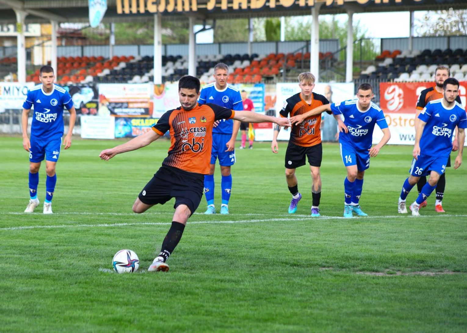 Miejscowi do bramki KSZO trafili już w 9 minucie a autorem bramki był były piłkarz ŁKS-u Łagów Damian Lepiarz. Radość gospodarzy nie trwała zbyt długo, ponieważ siedem minut później Michał Nawrot doprowadził do remisu. W drugiej części gry ostrowczanie nieco śmielej ruszyli do ataków. Efekty przyszły w 67 minucie, kiedy to dogranie Kamila Bełczowskiego na bramkę zamienił Oleksij Maydenewycz. Zwycięstwa nie udało się utrzymać do ostatniego gwizdka sędziego. W 83 minucie Jakub Burek skapitulował po raz drugi, strzelcem bramki był doświadczony Jarosław Kosieradzki. Podopieczni Rafała Wójcika utrzymali dobrą passę i zaliczyli siódmy ligowy mecz bez porażki.