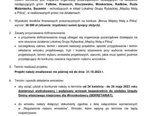 Celem konkursu jest wsparcie organizacji pozarządowych działających na obszarze następujących gmin: Fałków, Krasocin, Kluczewsko, Moskorzew, Radków, Ruda Maleniecka, Secemin - wchodzących w skład Lokalnej Grupy Rybackiej „Między Nidą a Pilicą”, w realizowanych przez nie działaniach.