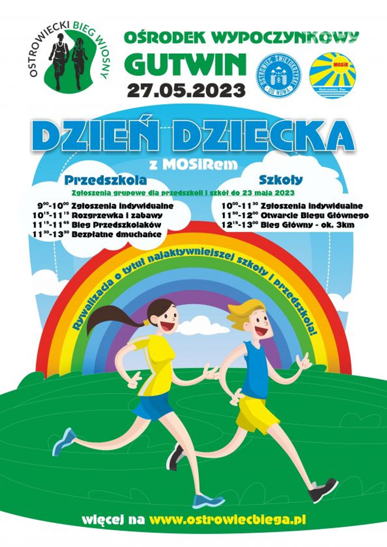 Impreza rozpocznie się od atrakcji skierowanych do najmłodszych, czyli dzieci w wieku przedszkolnym. Od godziny 9 w namiocie obok budynku administracyjnego rozpocznie pracę biuro zawodów, w którym rodzice i opiekunowie prawni będą mogli dokonać zapisów indywidualnych swoich dzieci. W godzinach 10.15 – 11.15 na wyspie dzielącej zbiornik wodny przeprowadzone zostaną dla nich zabawy ruchowe, a w godzinach 11.15 - 11.45 bieg na dystansie 100 metrów. Ponadto dla wszystkich dzieci przebywających w tym czasie w Ośrodku Wypoczynkowym Gutwin organizatorzy przygotowali szereg innych ciekawych atrakcji, między innymi dmuchańce, które dla uczestników Ostrowieckiego Biegu Wiosny zostaną tego podczas imprezy udostępnione bezpłatnie.